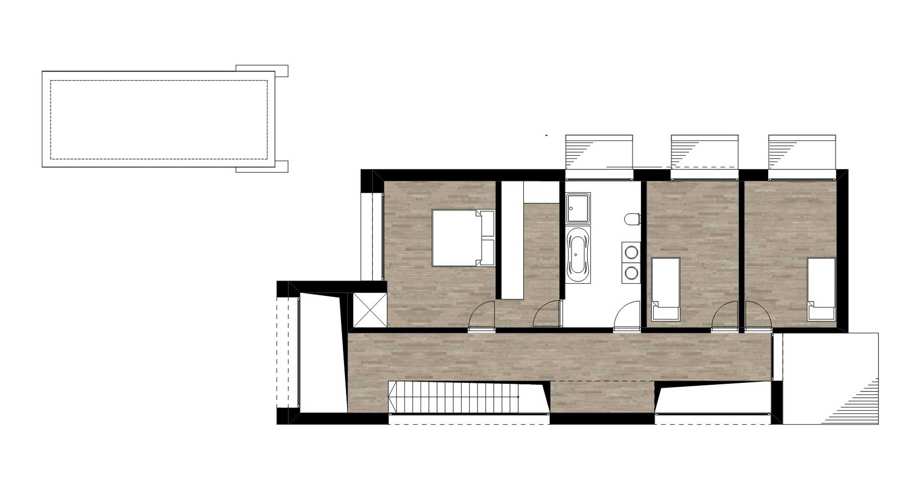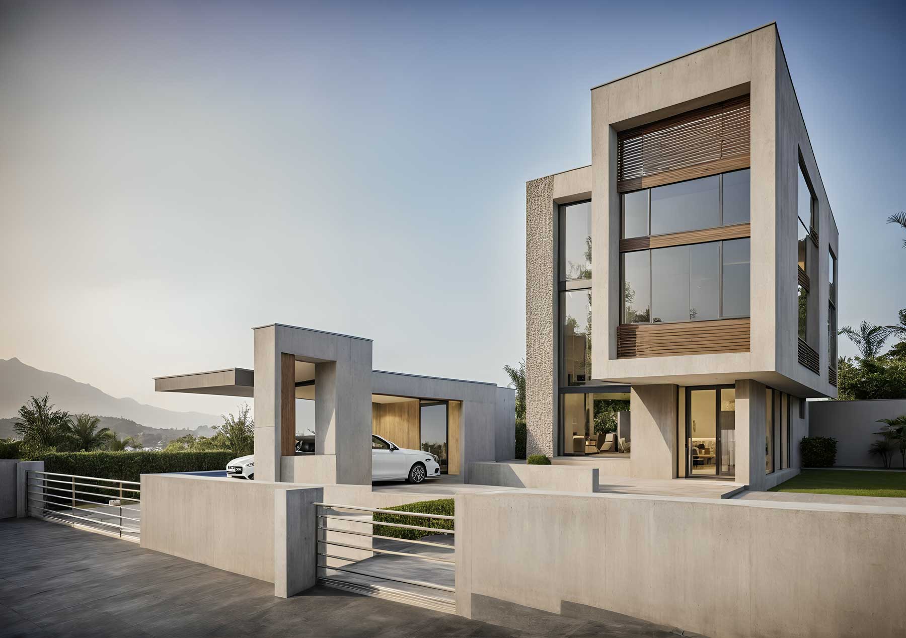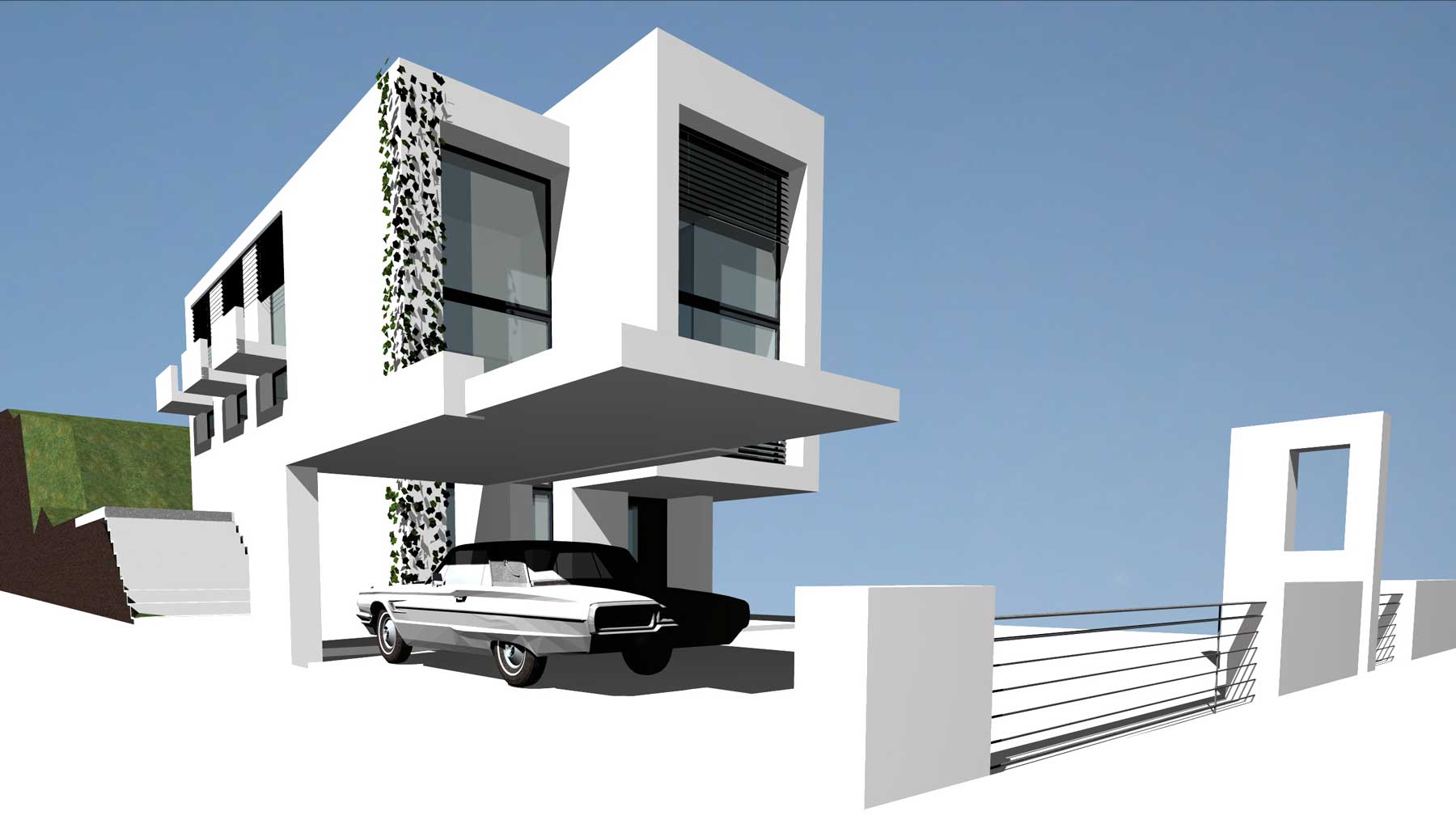 Eine moderne Architektursprache kennzeichnet diesen Entwurf, geprägt von weit auskragenden Baukörpern und großzügigen Fensterflächen. Die kubisch-expressive Formensprache betont das kontrastreiche Wechselspiel zwischen offenen und geschlossenen Fassadenbereichen und verleiht dem Haus eine fast avantgardistische Wirkung.