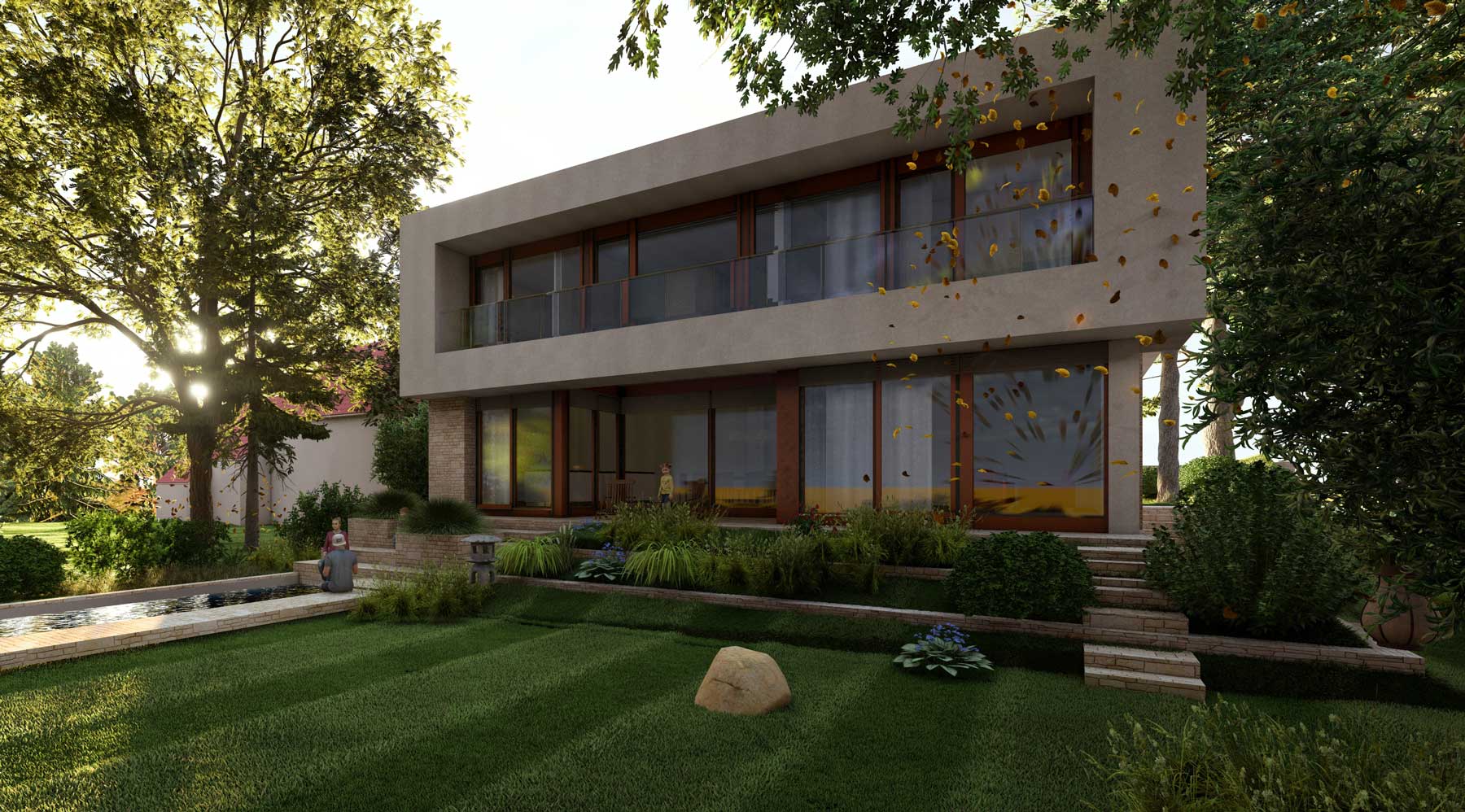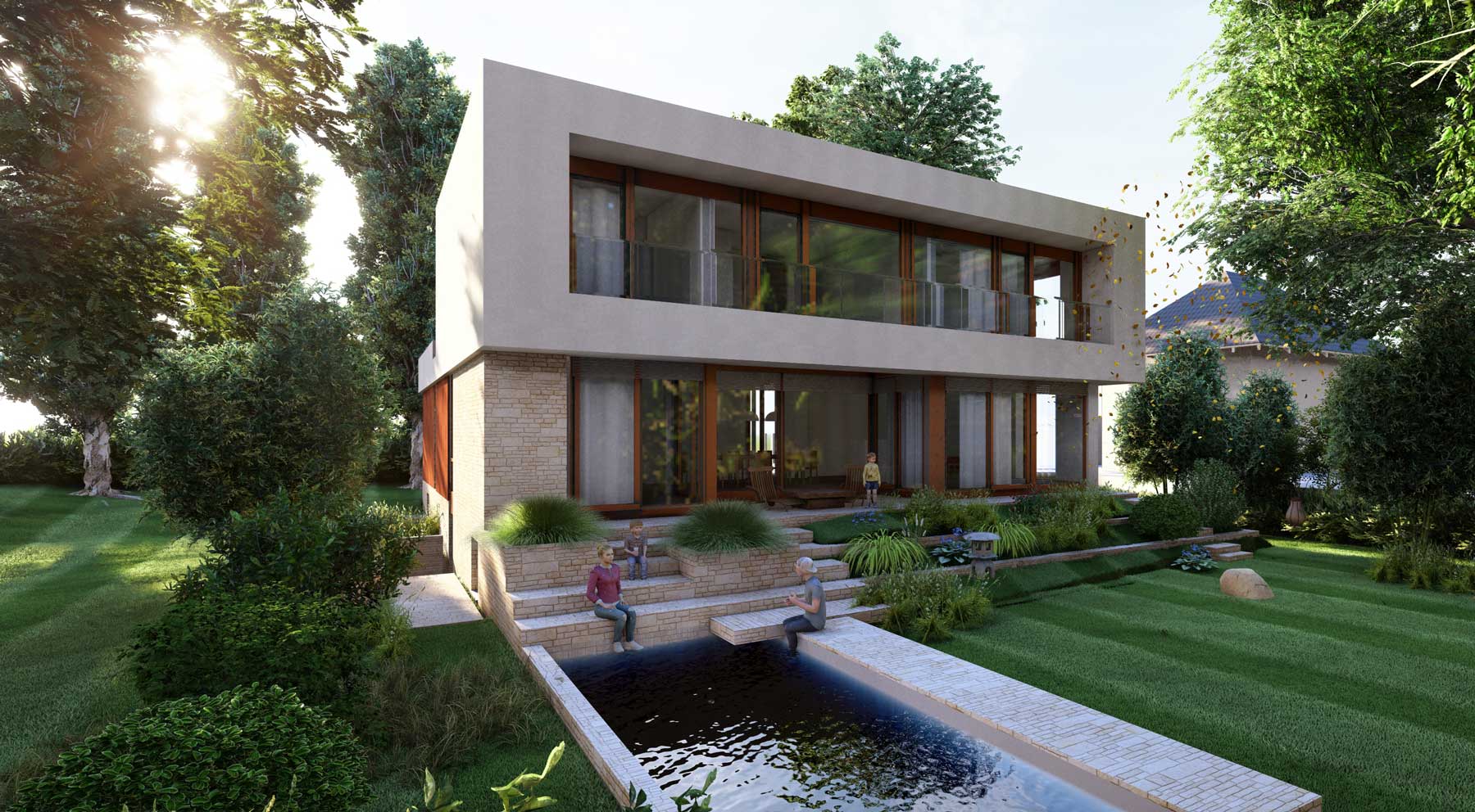 Der Garten wird durch ein Wasserbecken ergänzt, das als ruhiges Gestaltungselement wirkt und den Wechselbezug zwischen Architektur und Natur unterstreicht. So entsteht ein Zusammenspiel von Landschaft, Haus und Materialität, das sowohl repräsentativ als auch einladend wirkt.