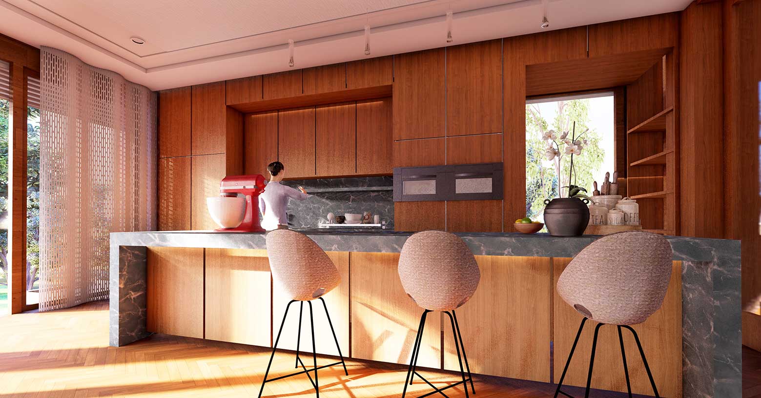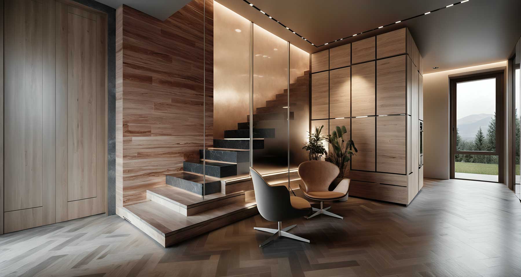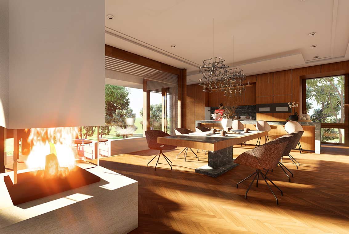 Die Innenräume sind auf Wunsch des Bauherrn stark von Holzmaterialien geprägt. Maßgefertigte Einbauten mit warmen Oberflächen erzeugen eine wohnliche Atmosphäre, die im Dialog mit der klaren Architektursprache für Behaglichkeit sorgt.
