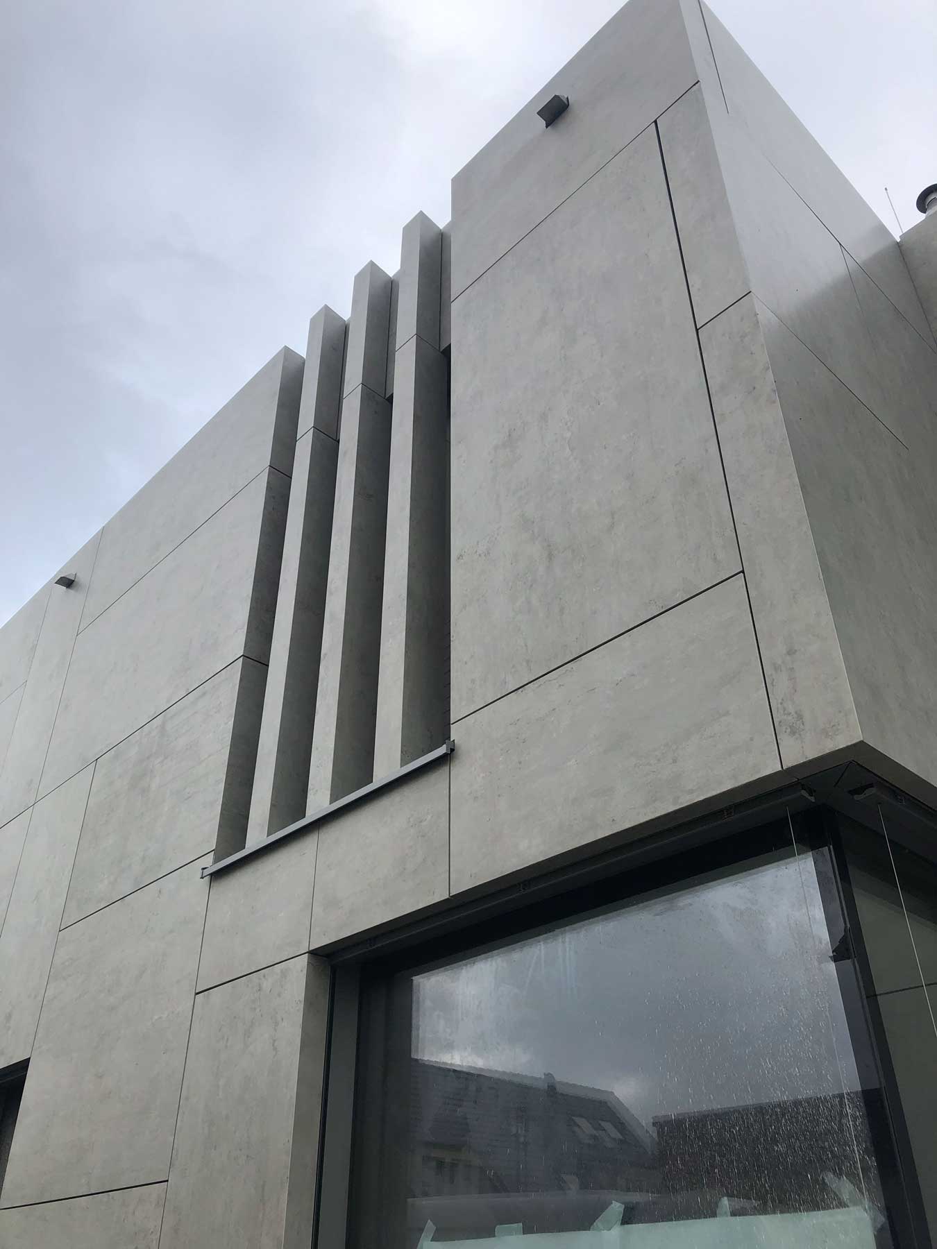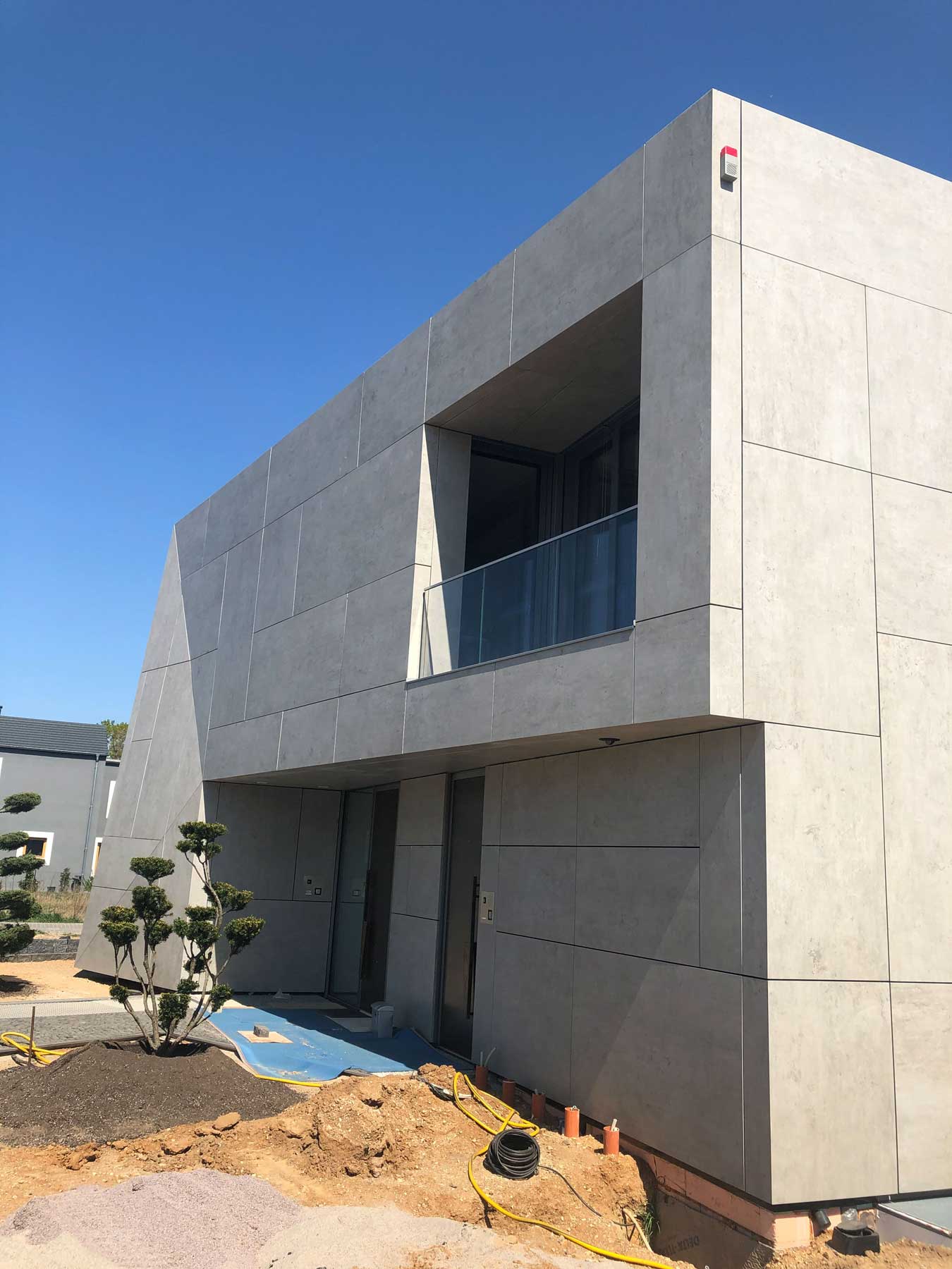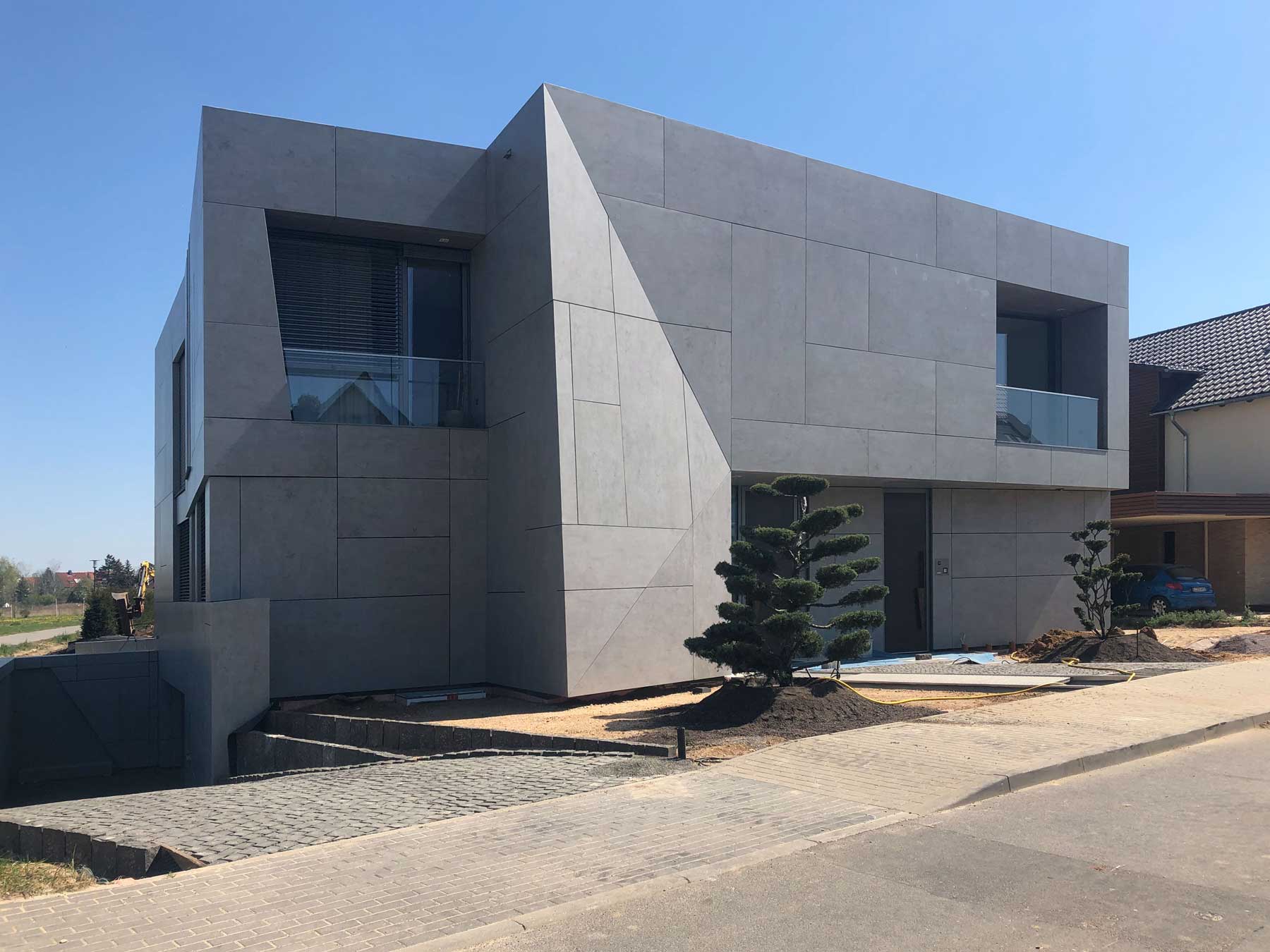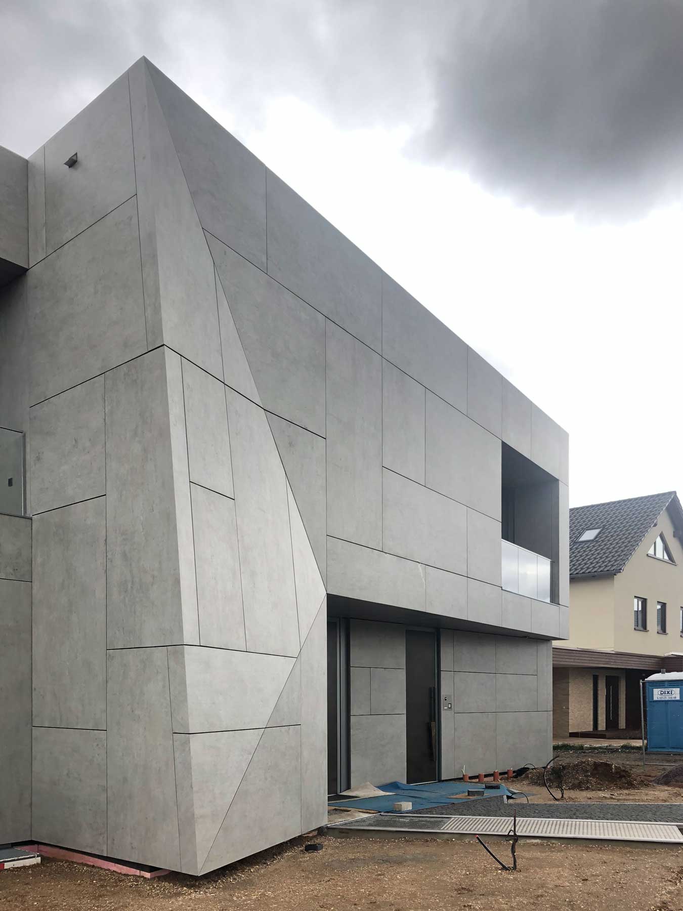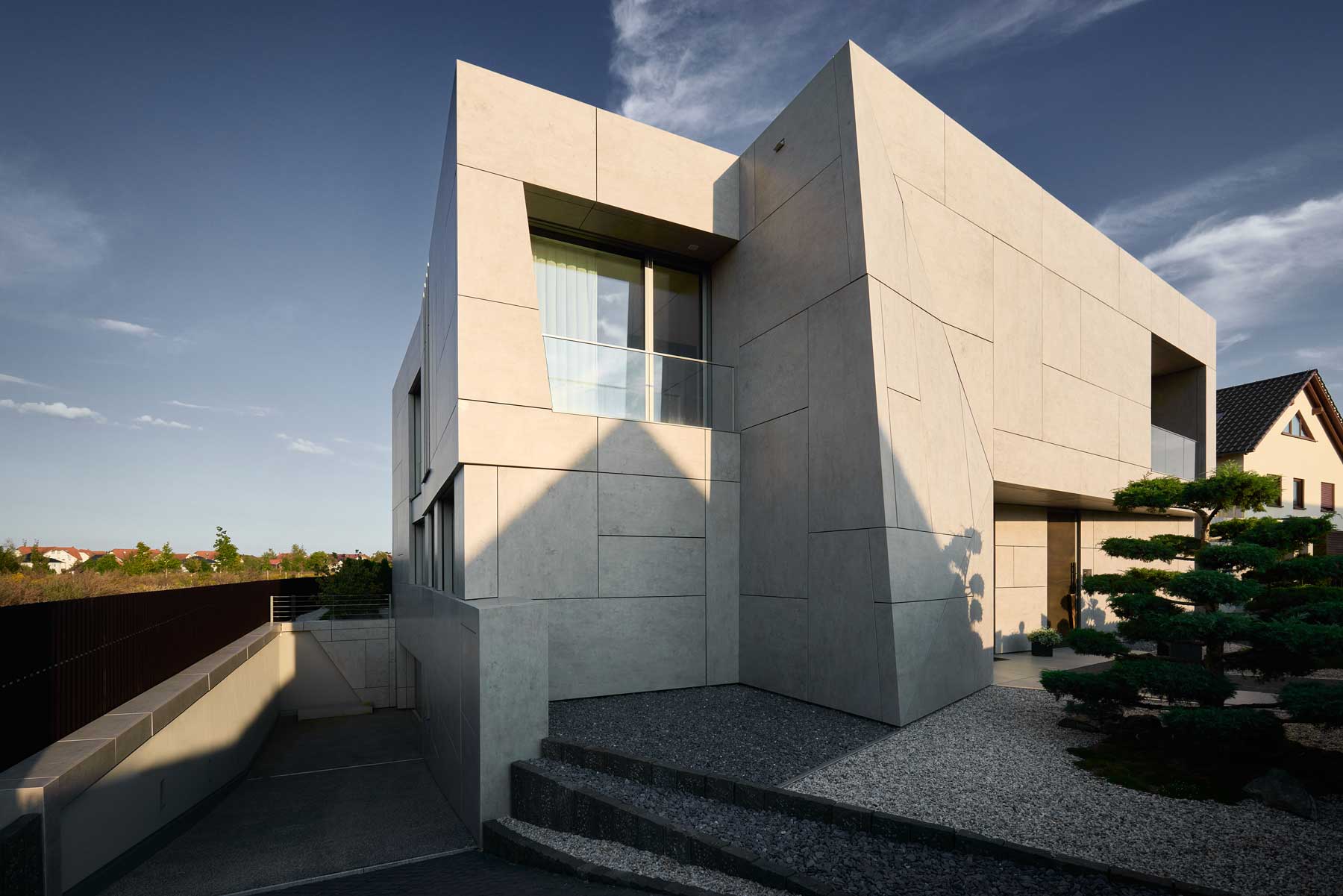 Der Entwurf dieses avantgardistischen Einfamilienhauses ist geprägt von einer entschieden experimentellen Formensprache und dem innovativen Einsatz großformatiger Fassadenplatten. Die präzise Fügung der Elemente erzeugt eine fast monolithische Anmutung, die durch feine Einschnitte, Rücksprünge und Überlagerungen spannungsvolle Plastizität erhält.