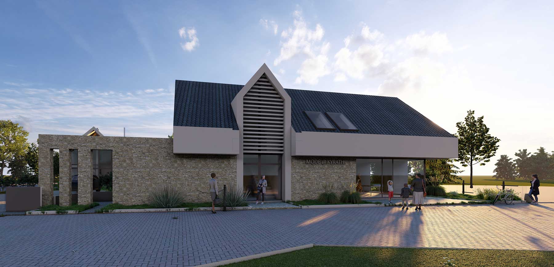 Architektonisch prägend ist die Verbindung traditioneller Bauweisen mit modernen Gestaltungsakzenten: Die Fassade erhält eine Verkleidung aus Naturstein, während die Dachflächen in regionaltypischer Weise mit Reet gedeckt werden. Große Glasflächen im Erdgeschoss sorgen allseits für Transparenz und Offenheit, während die differenzierte Gliederung des Baukörpers dessen Mischfunktion betont.