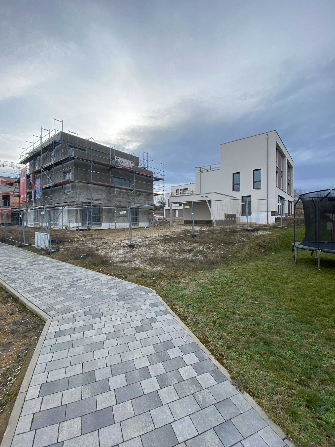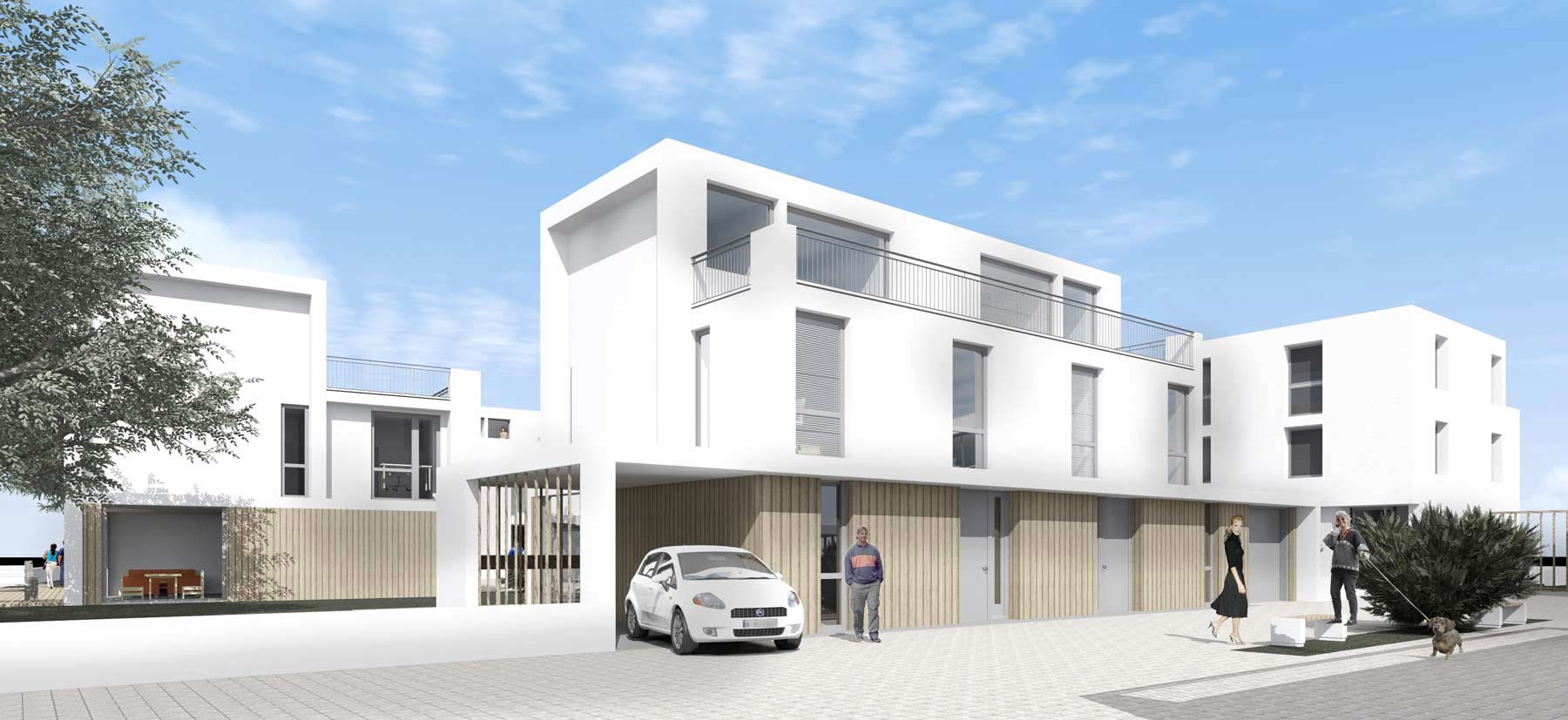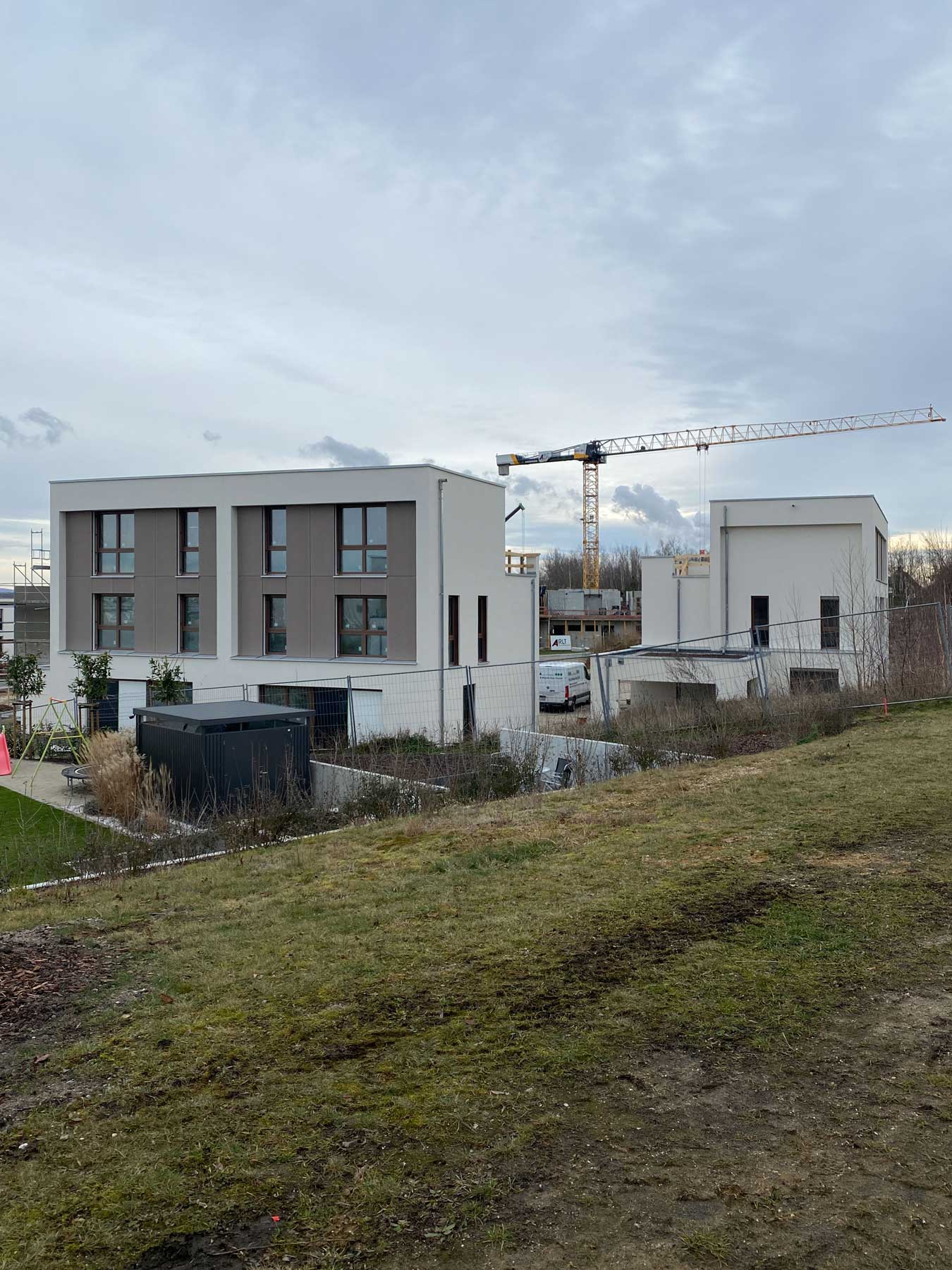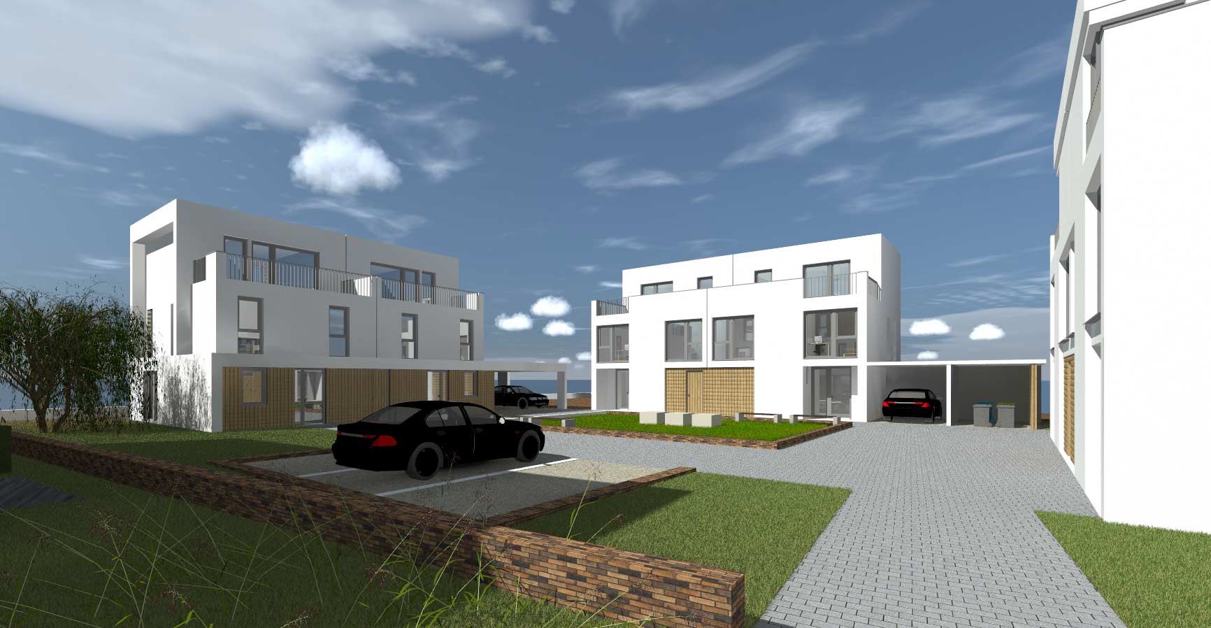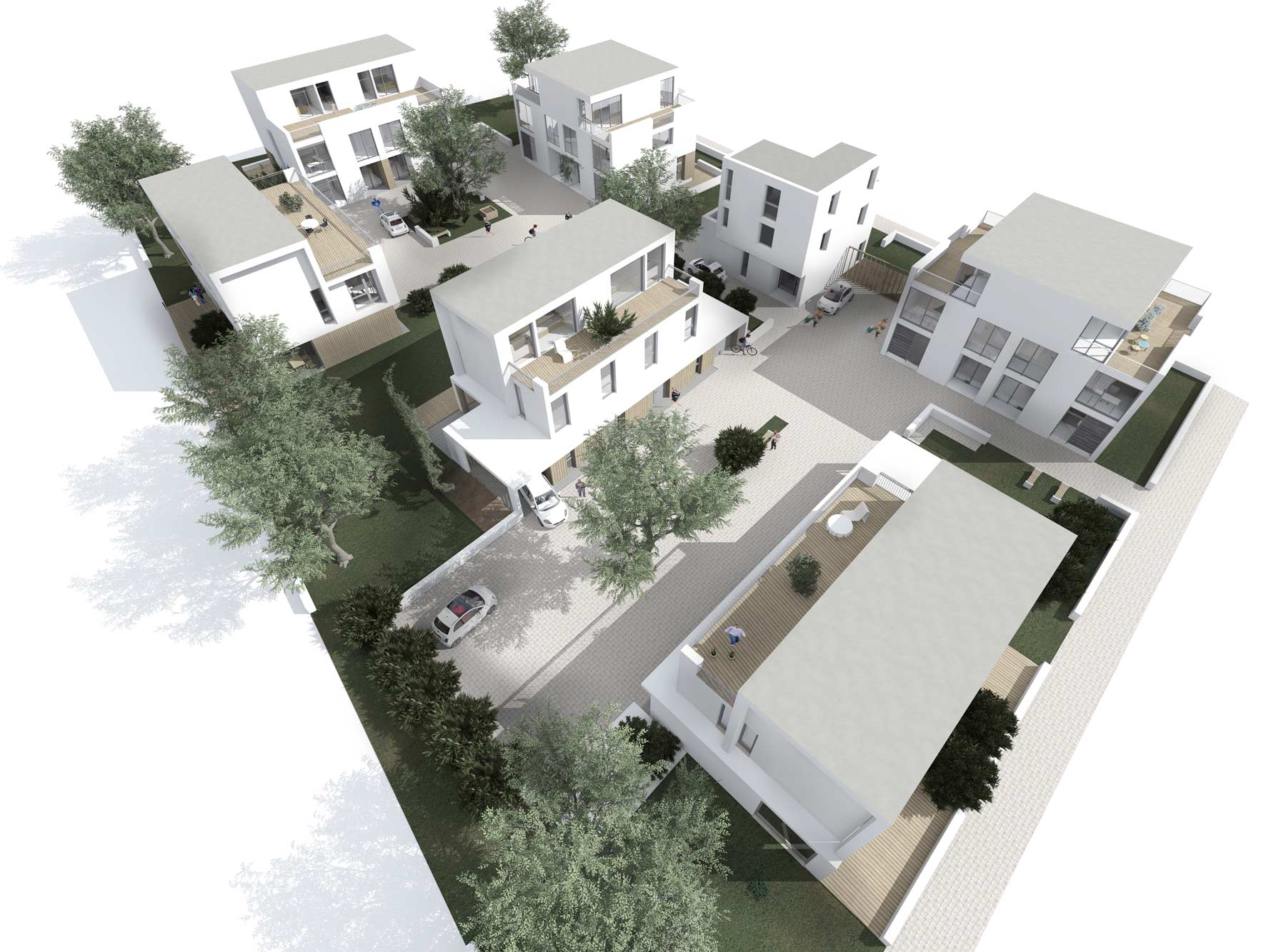 Im Mittelpunkt steht das gemeinschaftliche Wohnen. Doppelhäuser und Wohnungen gruppieren sich um grüne Höfe und bilden ein kleines Quartier, das Begegnung, Austausch und Nachbarschaft fördert. Großzügige Terrassen und Balkone bieten Raum für Aufenthalt, Spiel und gemeinsame Freizeitgestaltung.