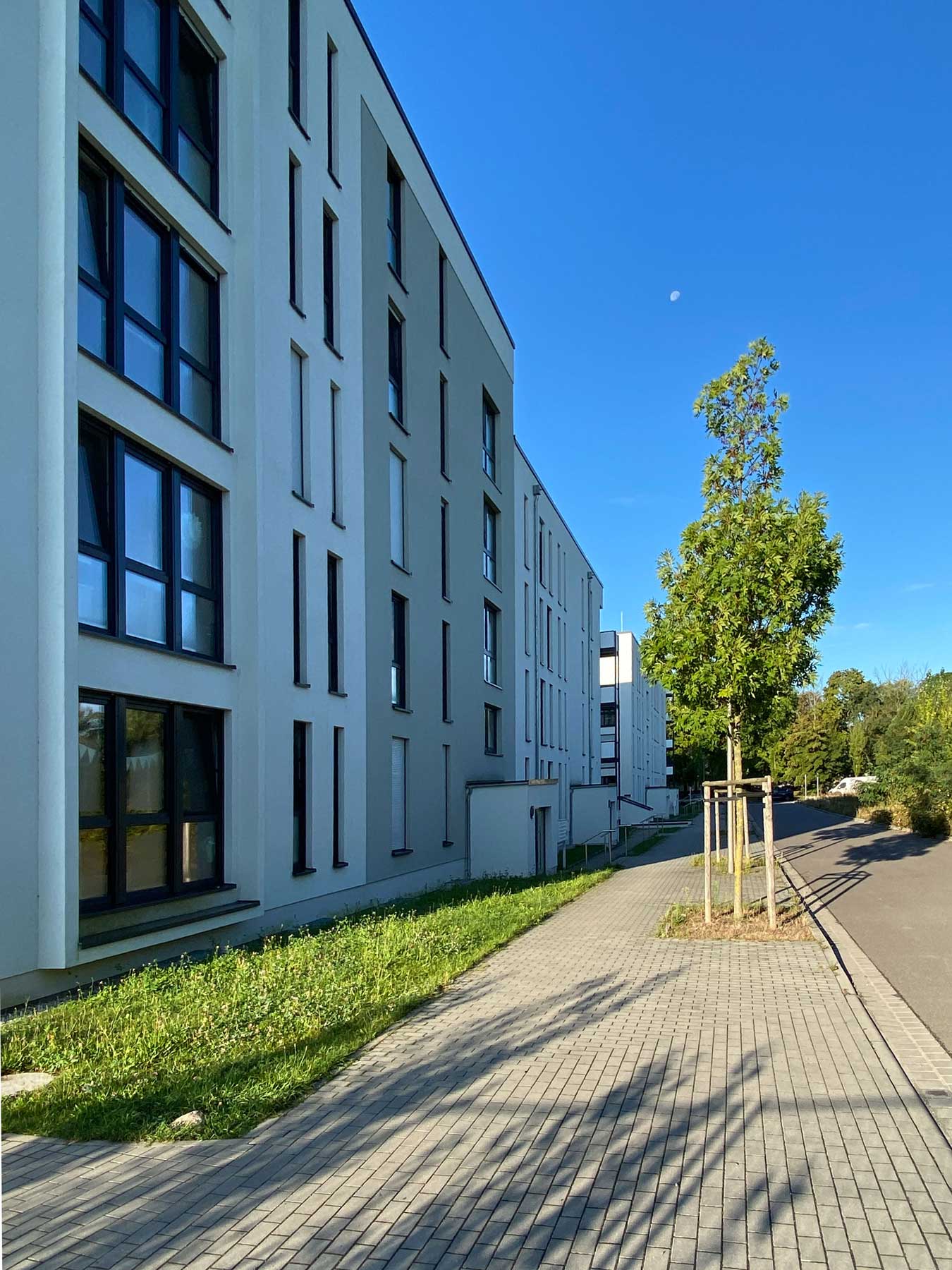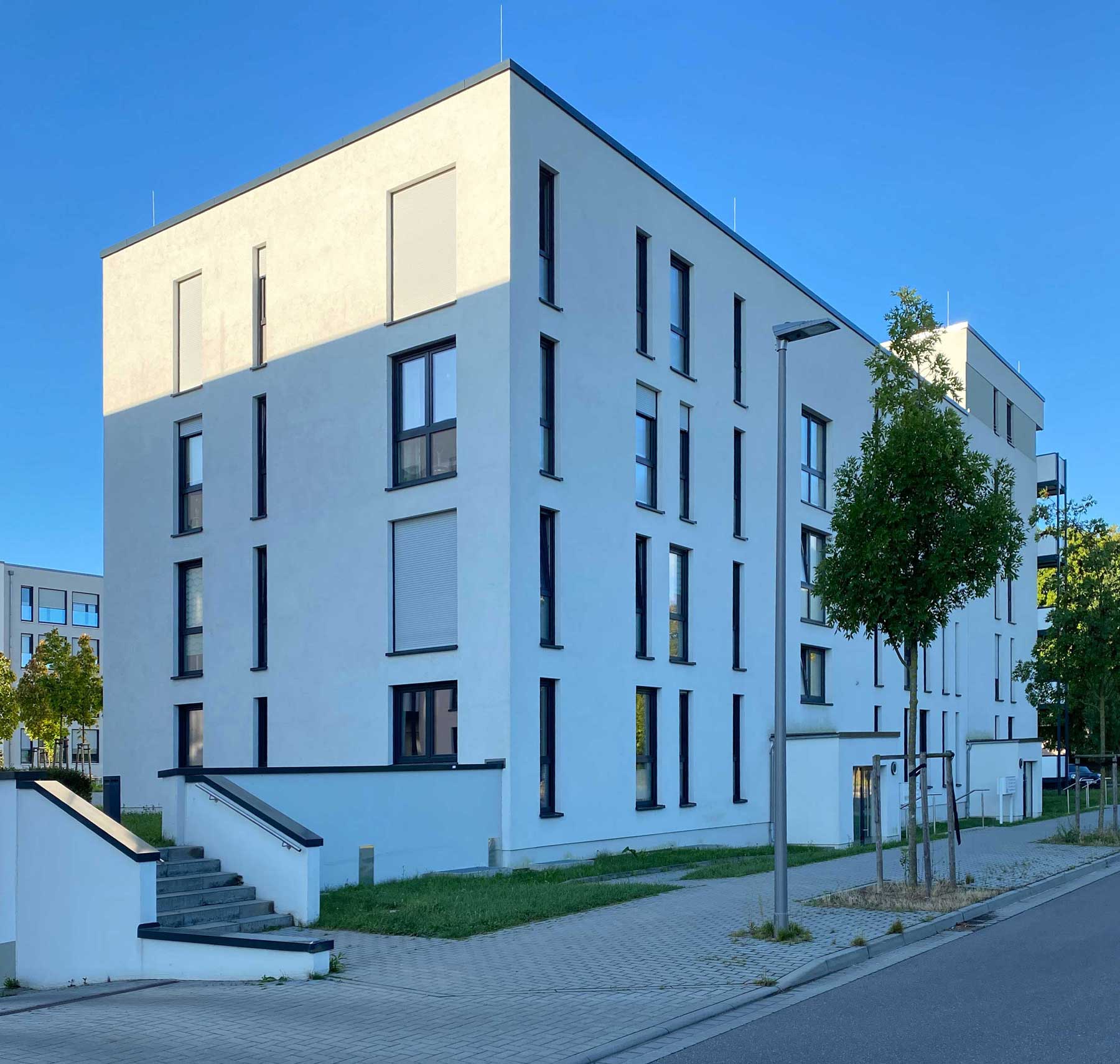 Bilder und Modell zeigen die Entwicklung eines kleinen Stadtquartiers, welches aus zwei L-förmigen Mehrfamilienwohnhäusern besteht. Die Gebäude sind mittels einer modernen Fassadengestaltung aus hellen Putzflächen, vertikalen Fensterbändern und Balkonen klar gegliedert.