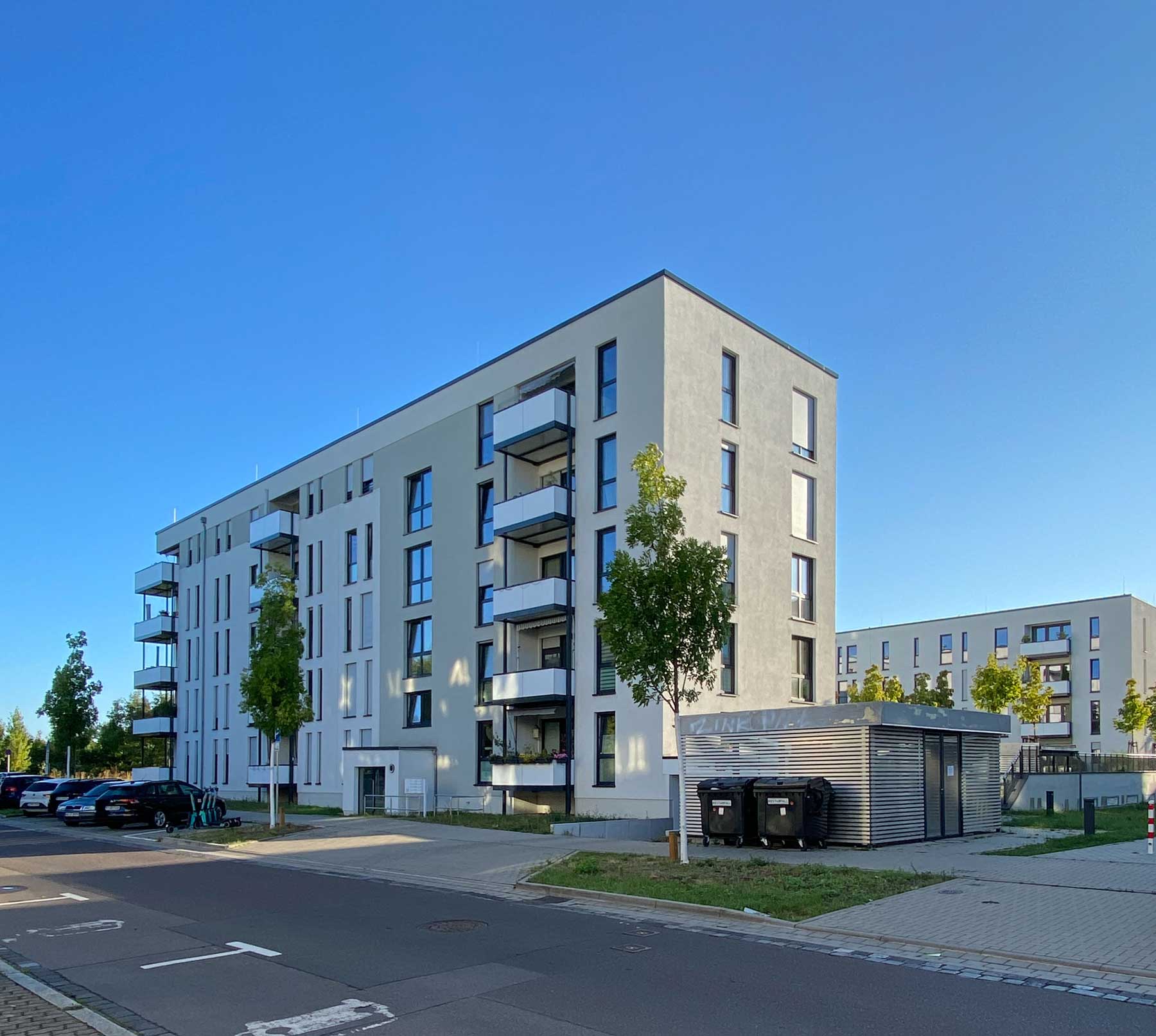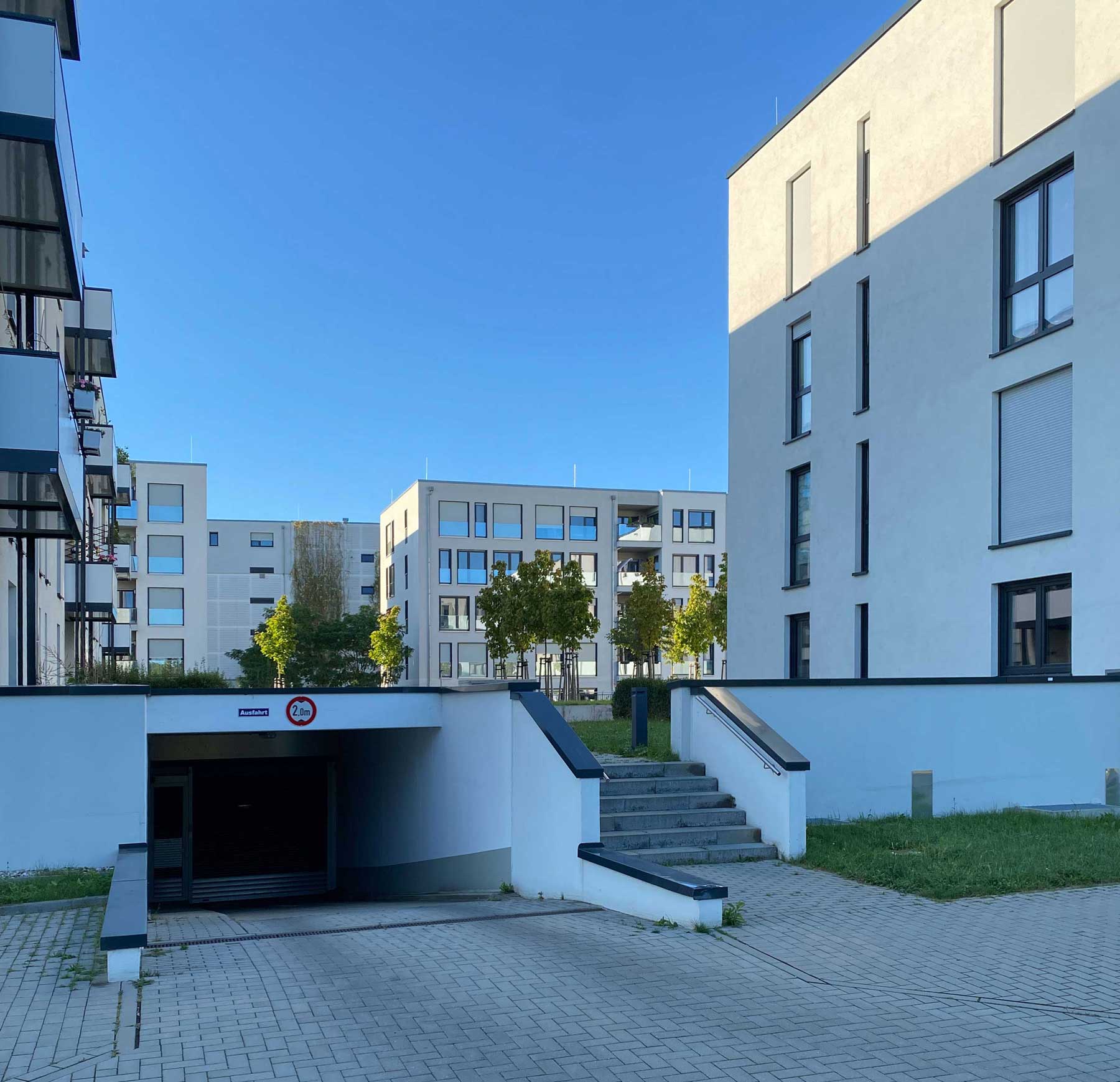 Ein wesentliches Merkmal ist die opulente Tiefgarage, welche Stellplätze für alle Wohneinheiten bereitstellt. Dadurch bleibt der Freiraum oberirdisch weitgehend autofrei und kann für wohnungsnahe Grünflächen, Fußwege und geschützte Spielbereiche genutzt werden.
