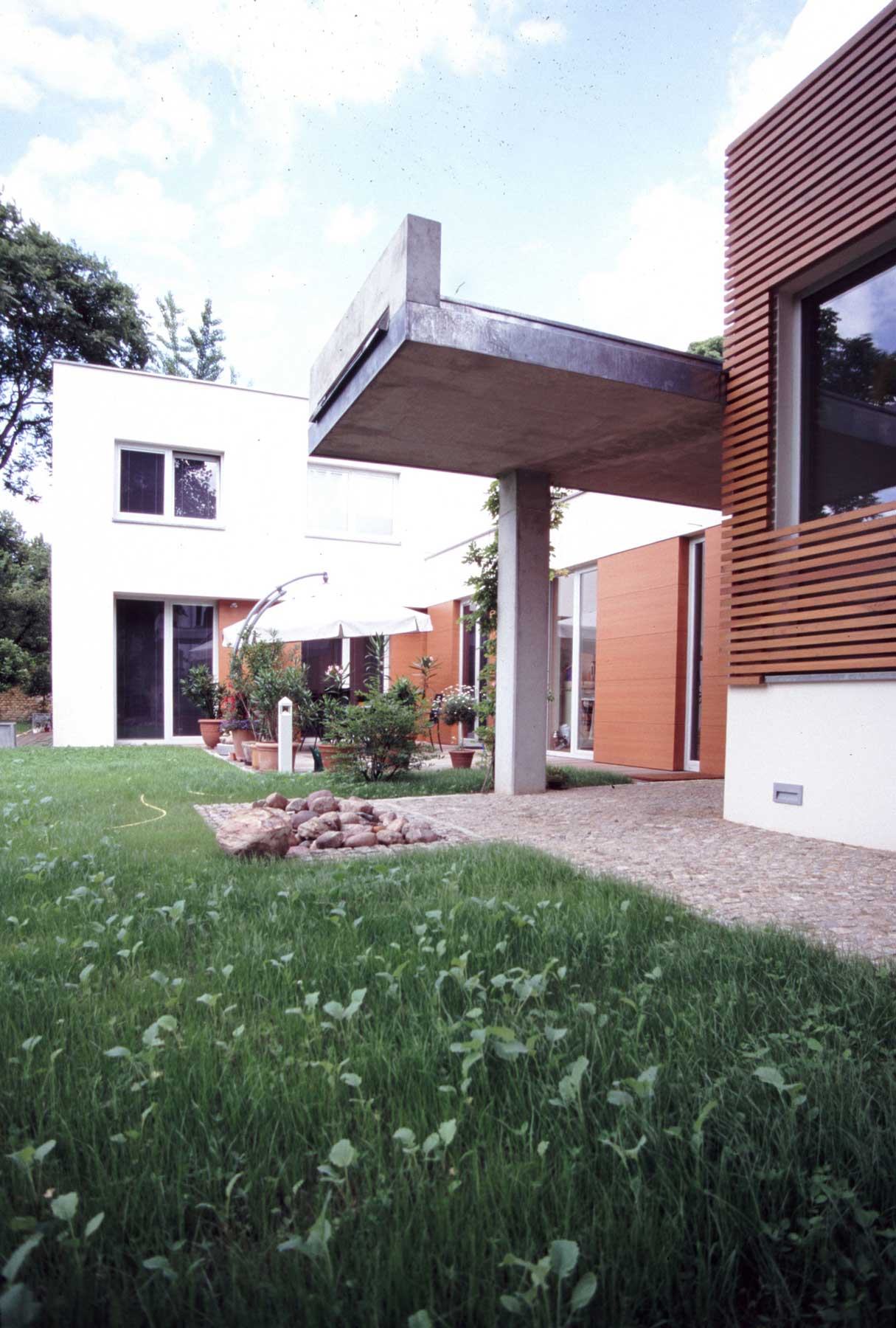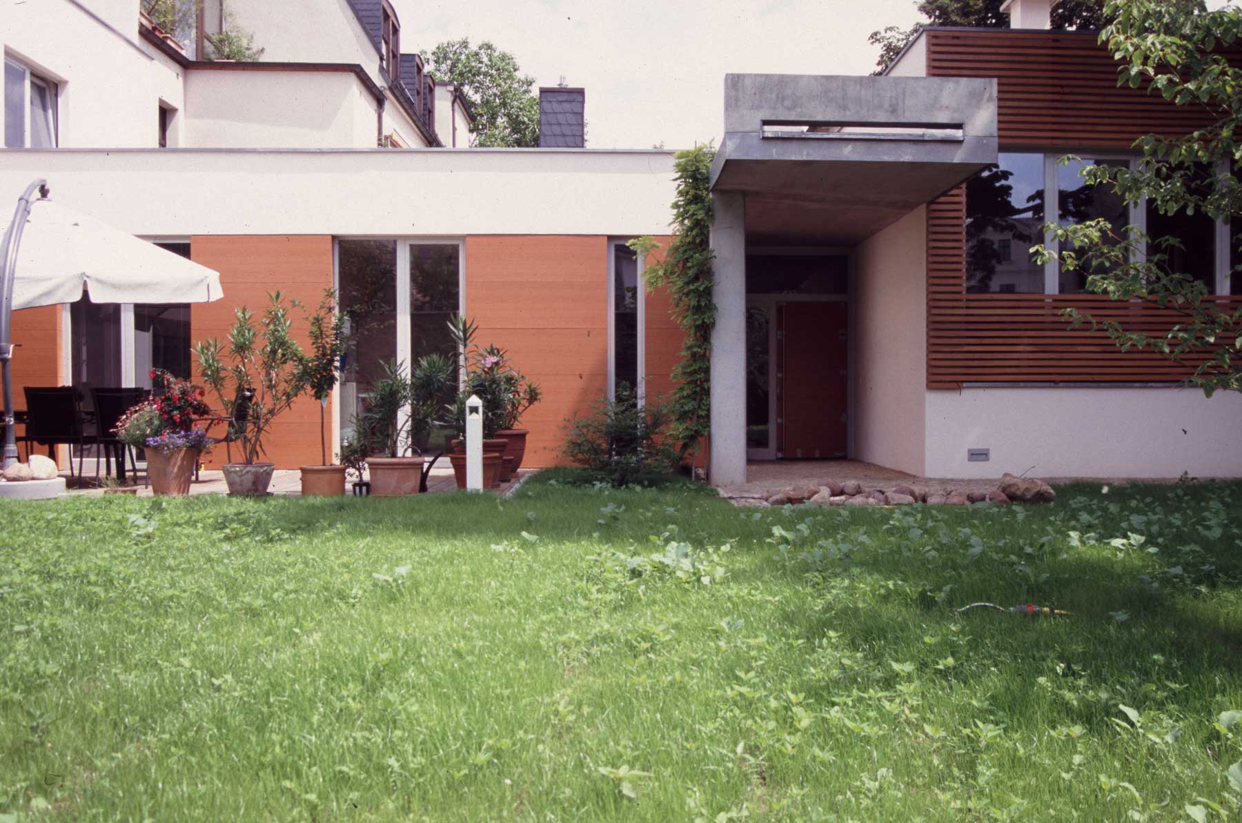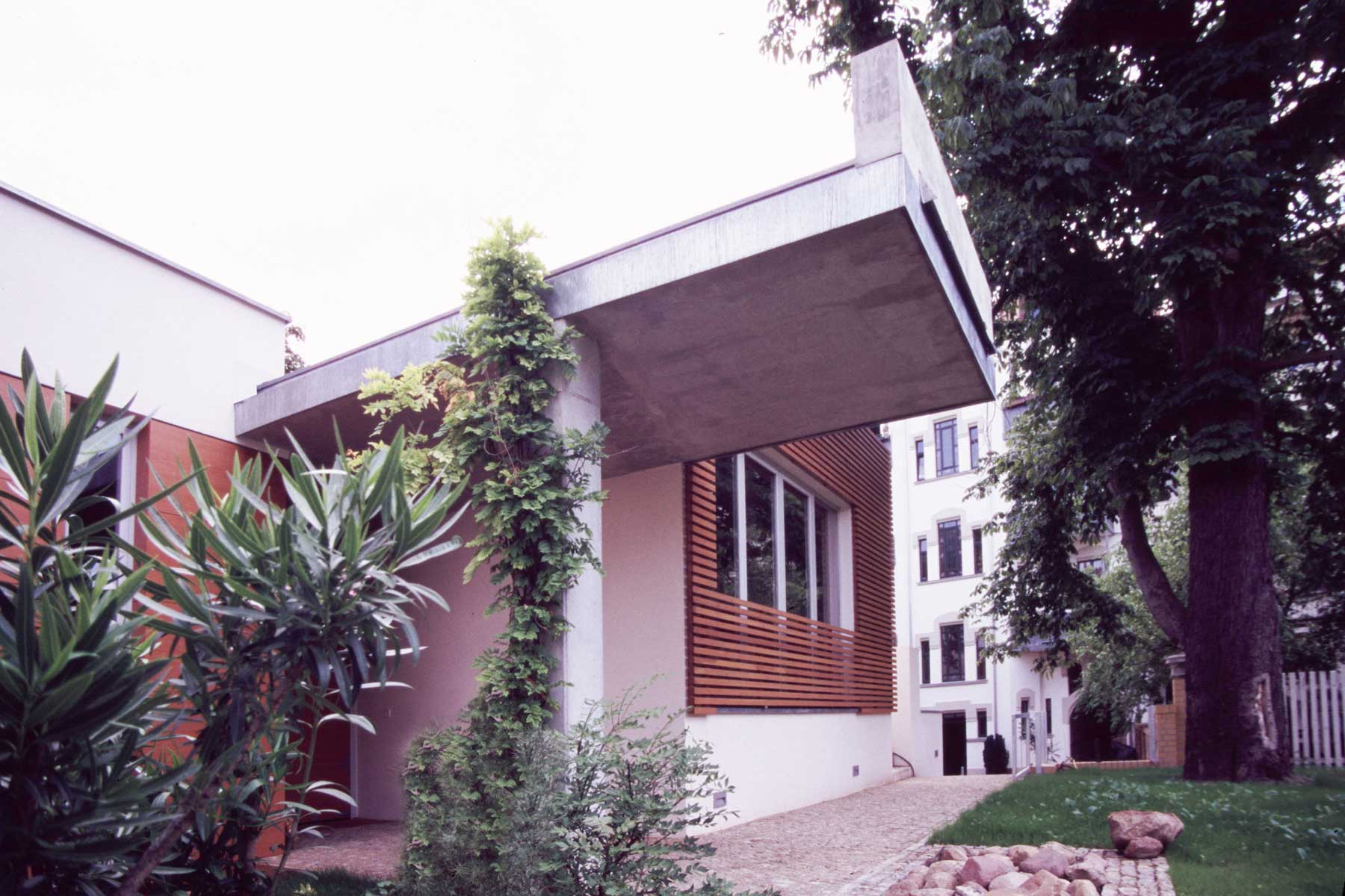 Ein prägnantes Architekturelement ist das kragende Vordach über dem Eingang. Es dient zugleich als Regenwassersammler und -ableiter, wobei sich bei Niederschlag ein plätschernder Wasserfall als akustisches Gestaltungsphänomen bildet.