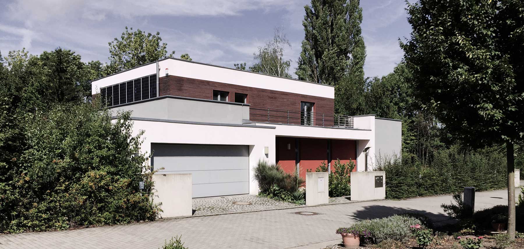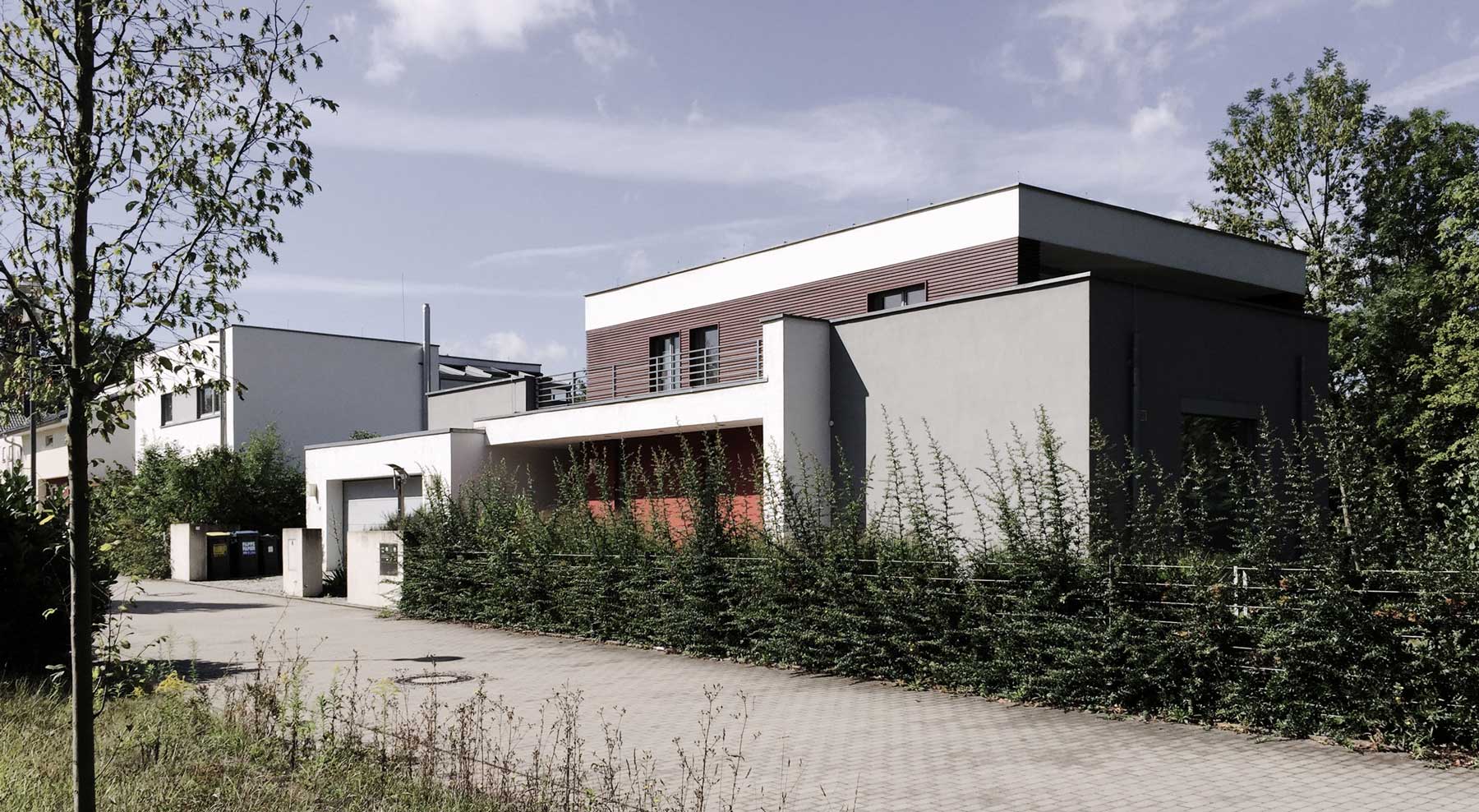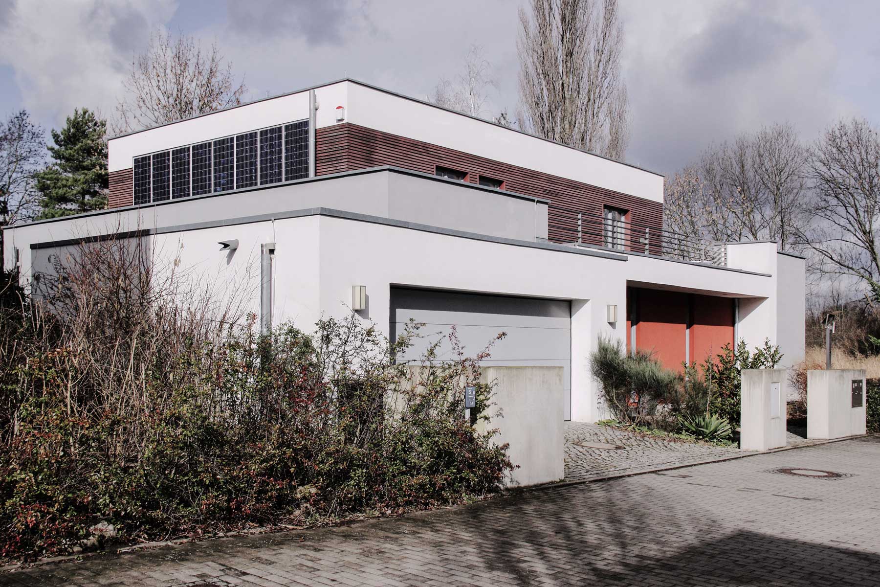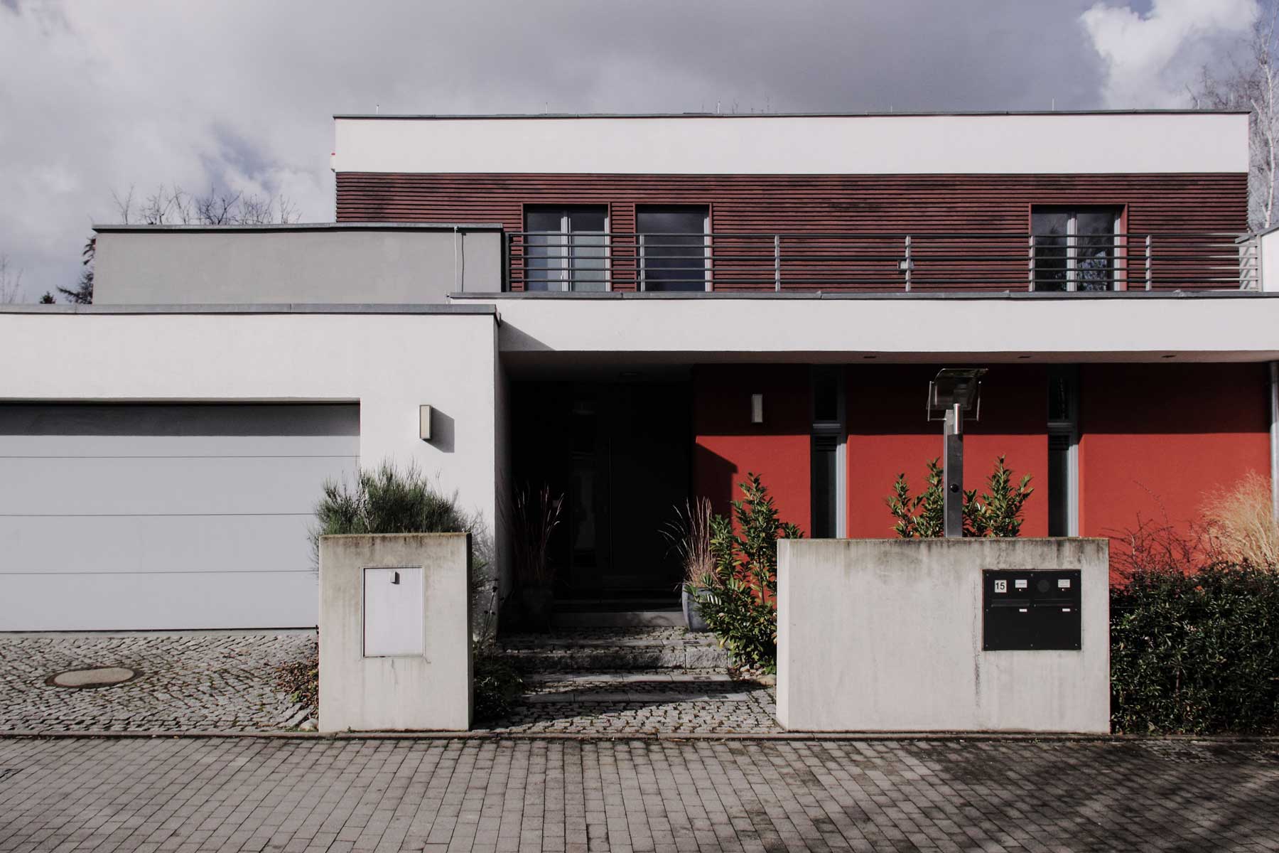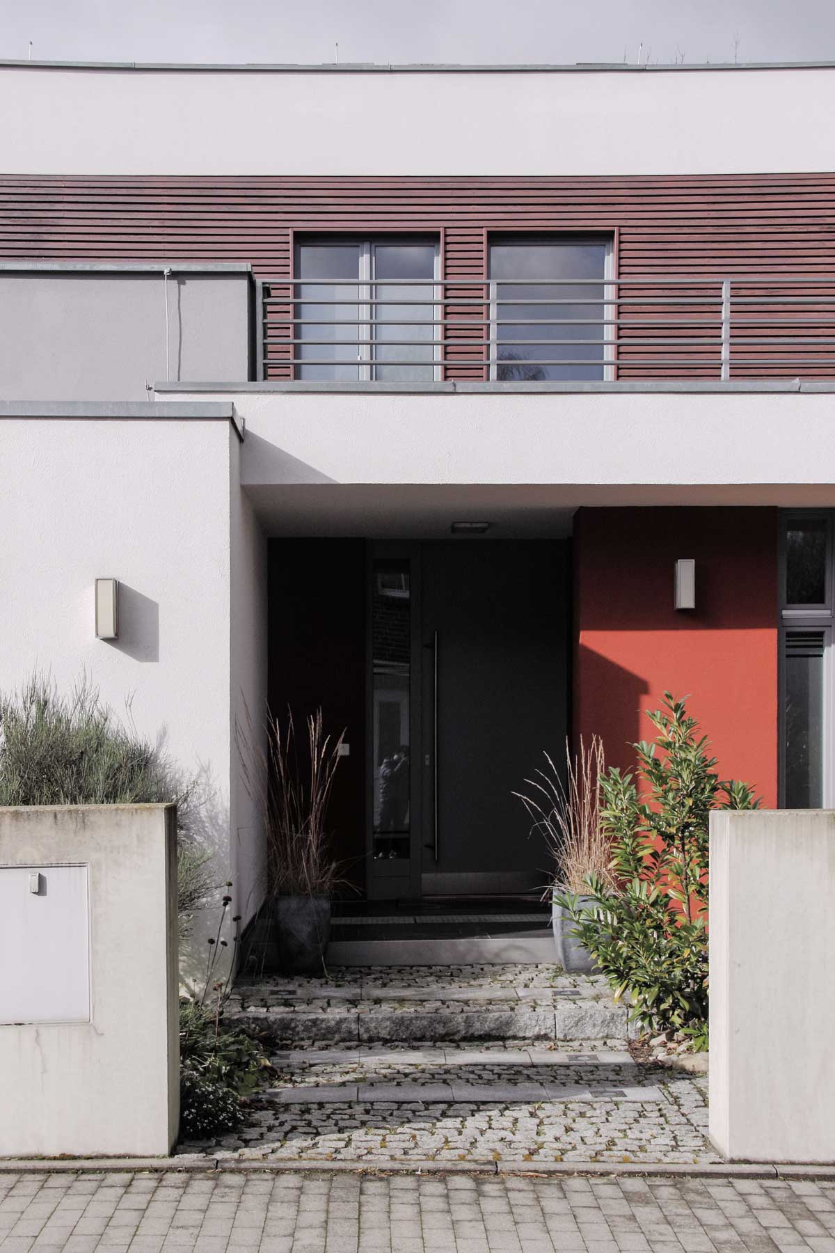 Das Haus ist Teil einer modernen Kleinsiedlung und zeichnet sich durch eine klar strukturierte Architektursprache aus. Die Frontfassade wird durch kompositorisch gesetzte Vor- und Rücksprünge gegliedert, wodurch sich das Gesamtvolumen differenziert und die einzelnen Bauelemente klar ablesbar werden.