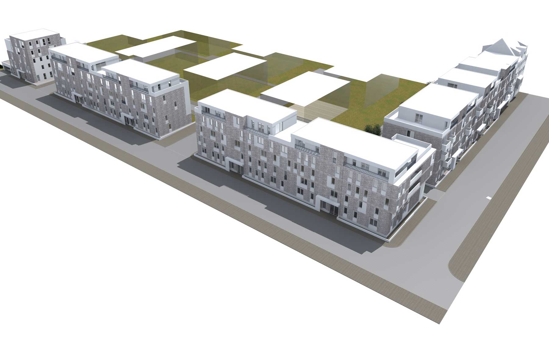Die klare Gliederung der Einzelbaukörper erzeugt gut proportionierte Wohnbereiche und schafft eine individuelle Adressbildung innerhalb des Quartiers. Großzügige Balkons, Loggien und Dachterrassen erweitern die Wohnungen in den Außenraum und tragen wesentlich zur Wohnqualität bei.