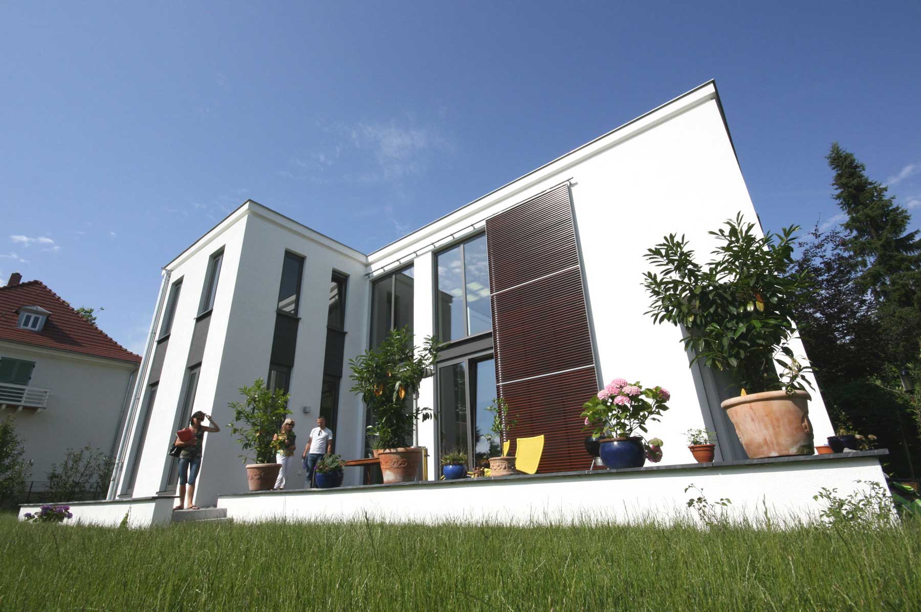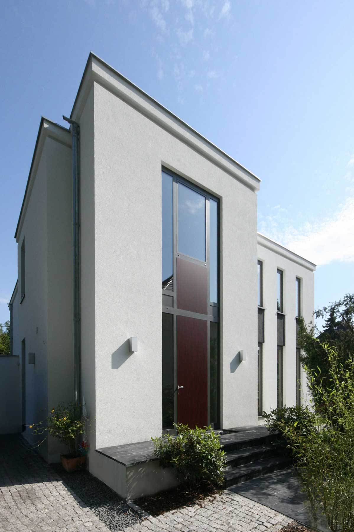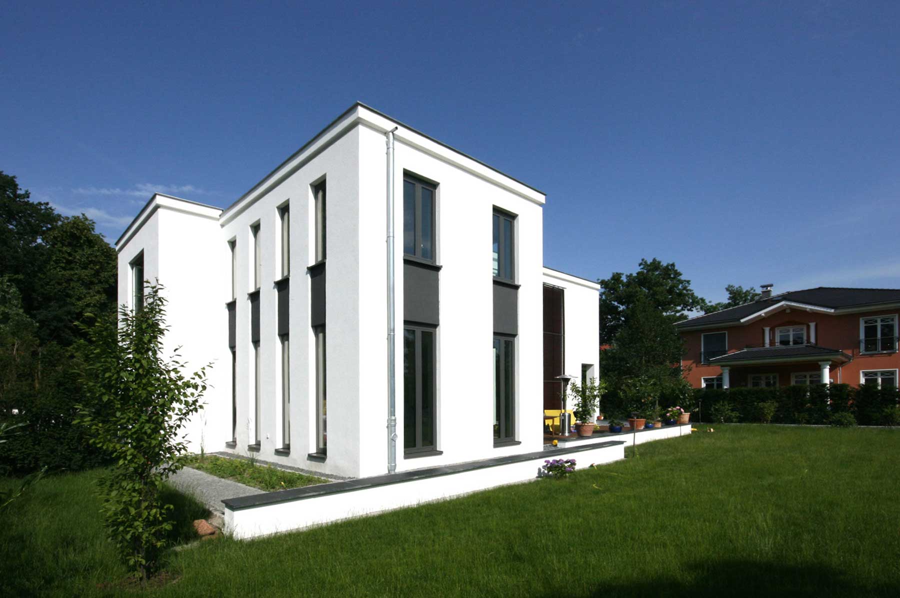 Das Haus verbindet eine für die Berliner Vorstadt typische, vorwiegend bürgerliche Architektursprache mit großzügiger Raumbildung und -wirkung. Ein streng gegliederter Baukörper, große Glasflächen und über zwei Geschosse verschiebbare Lamellen prägen das äußere Erscheinungsbild und schaffen spielerische Flexibilität im Umgang mit Lichteinfall und Schattenwurf.