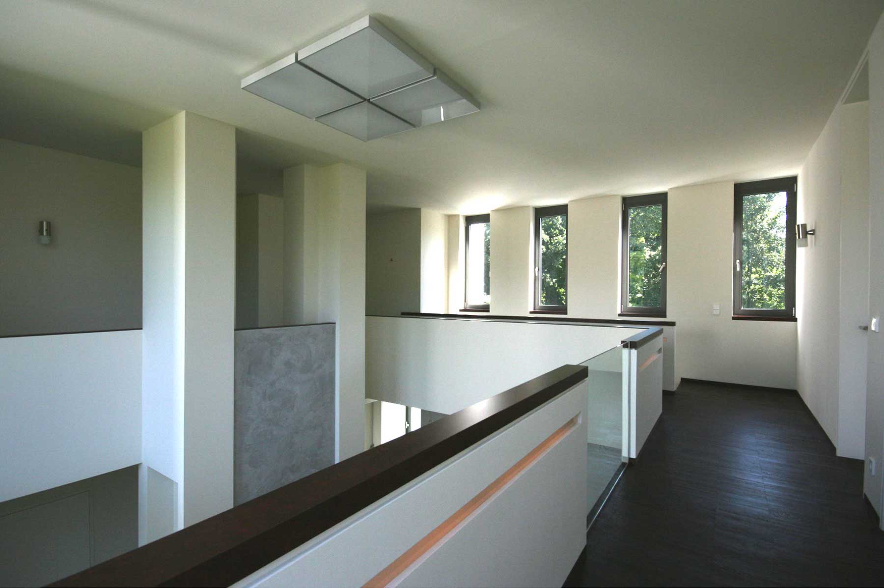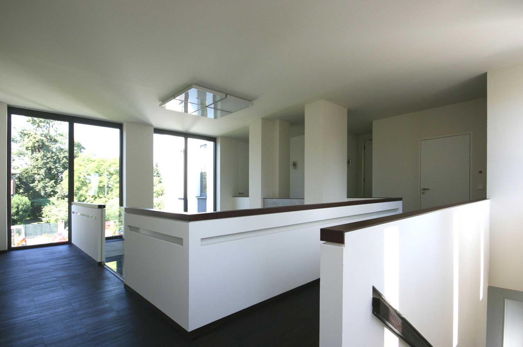 Im Inneren öffnet sich der Wohnbereich über zwei Etagen und entfaltet eine großzügige Atmosphäre. Die Galerie, von der alle Zimmer abgehen, verbindet das Obergeschoss mit dem offenen Wohnraum. Von hier oben eröffnet sich ein weiter Blick in den zentralen Bereich des Hauses.