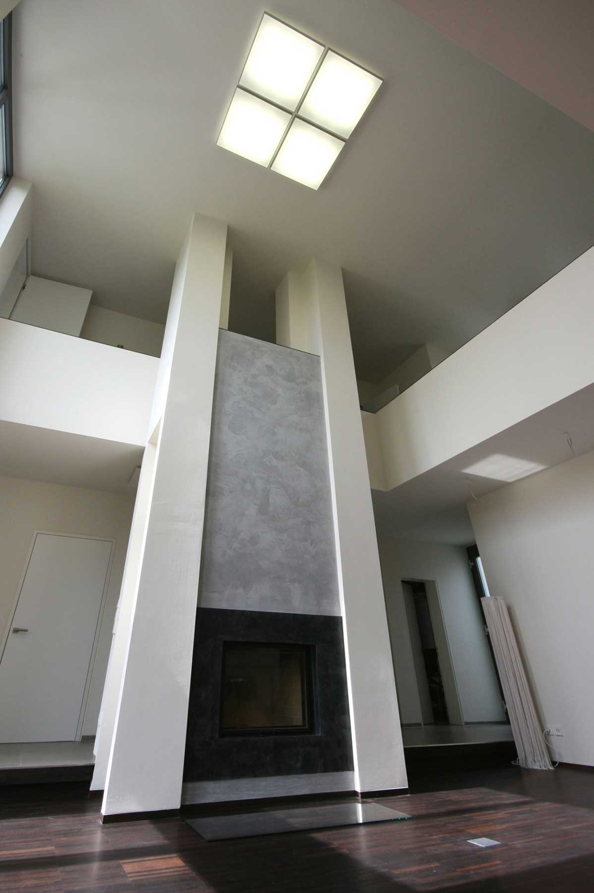 Der Kamin bildet dabei das Herzstück des Wohnens – als architektonischen Blickfang, der sich über beide Geschosse erhebt.