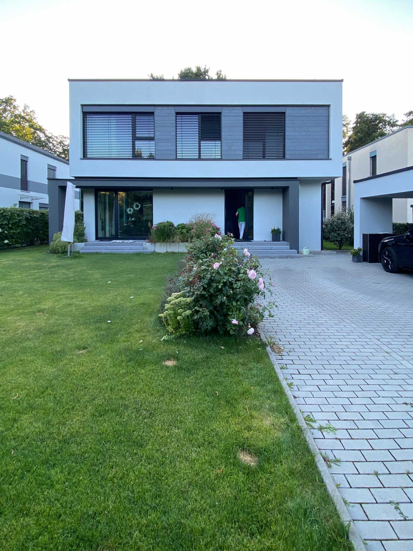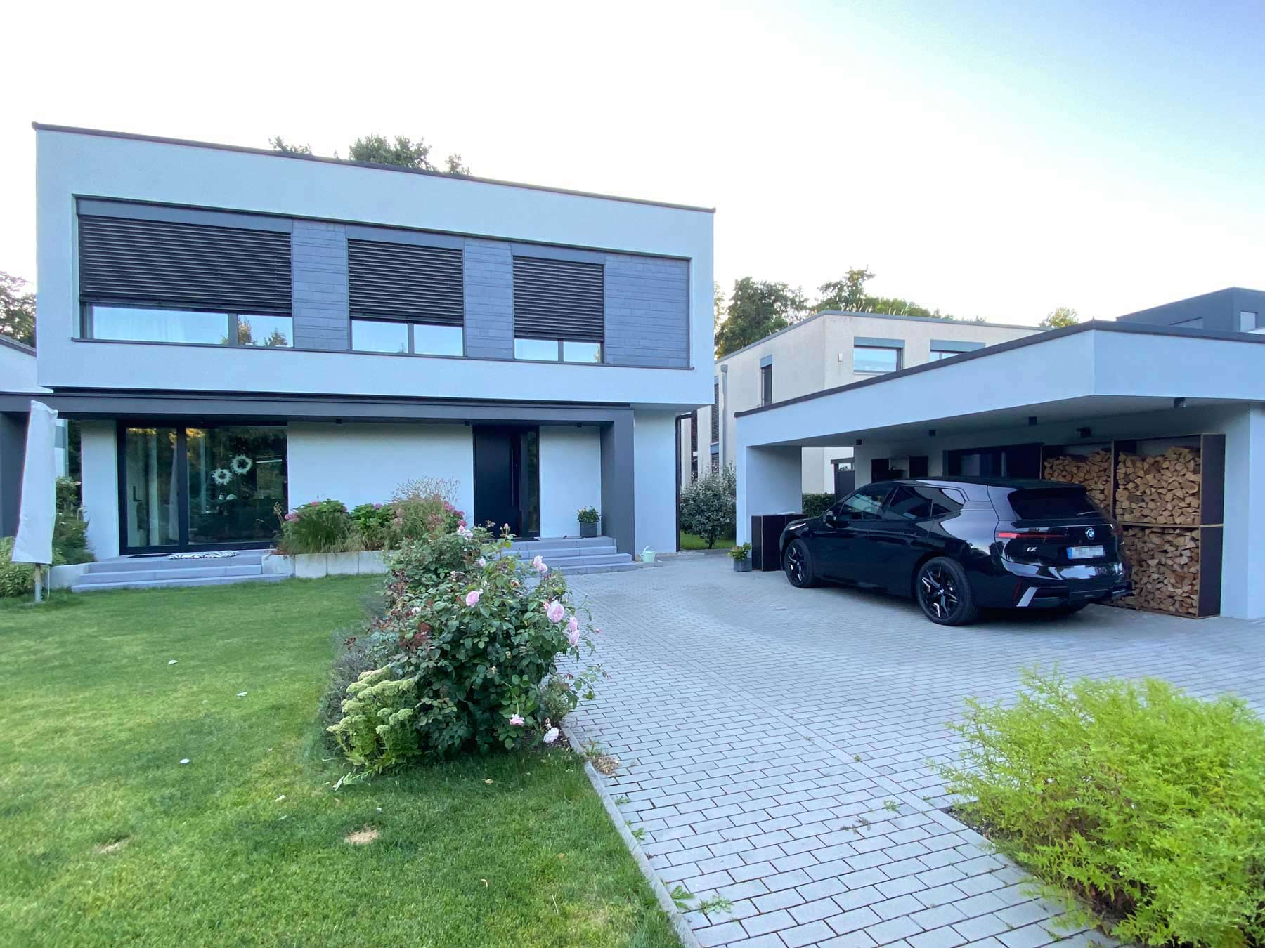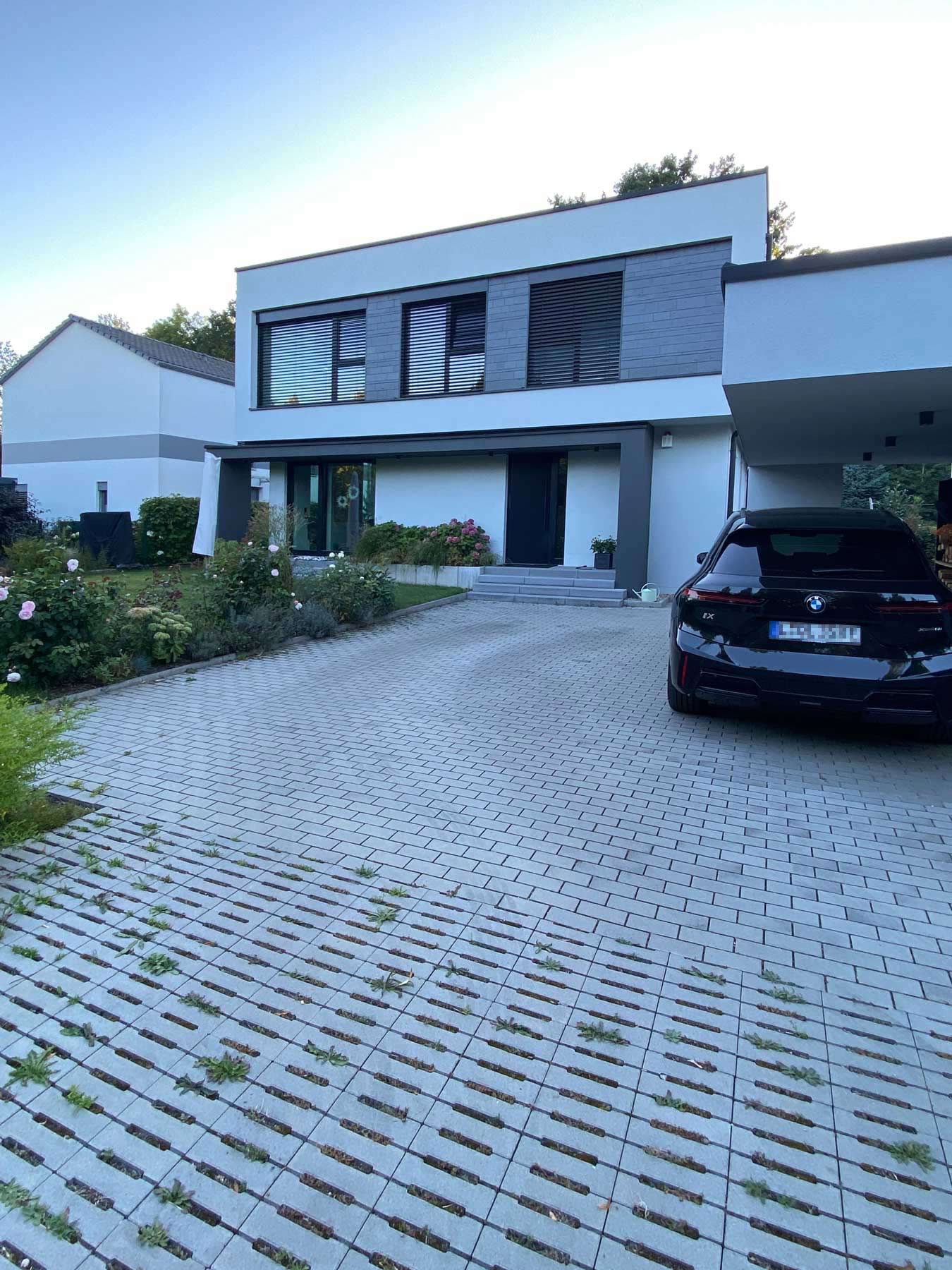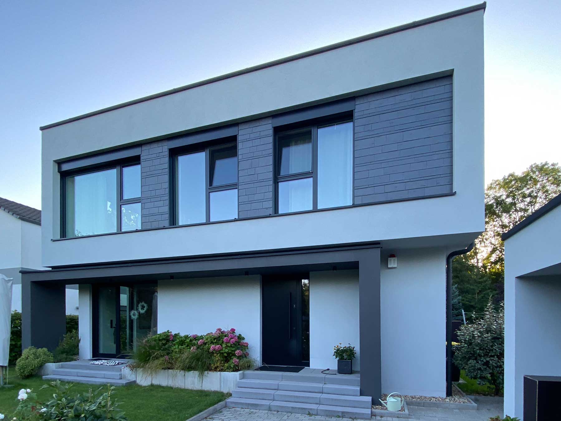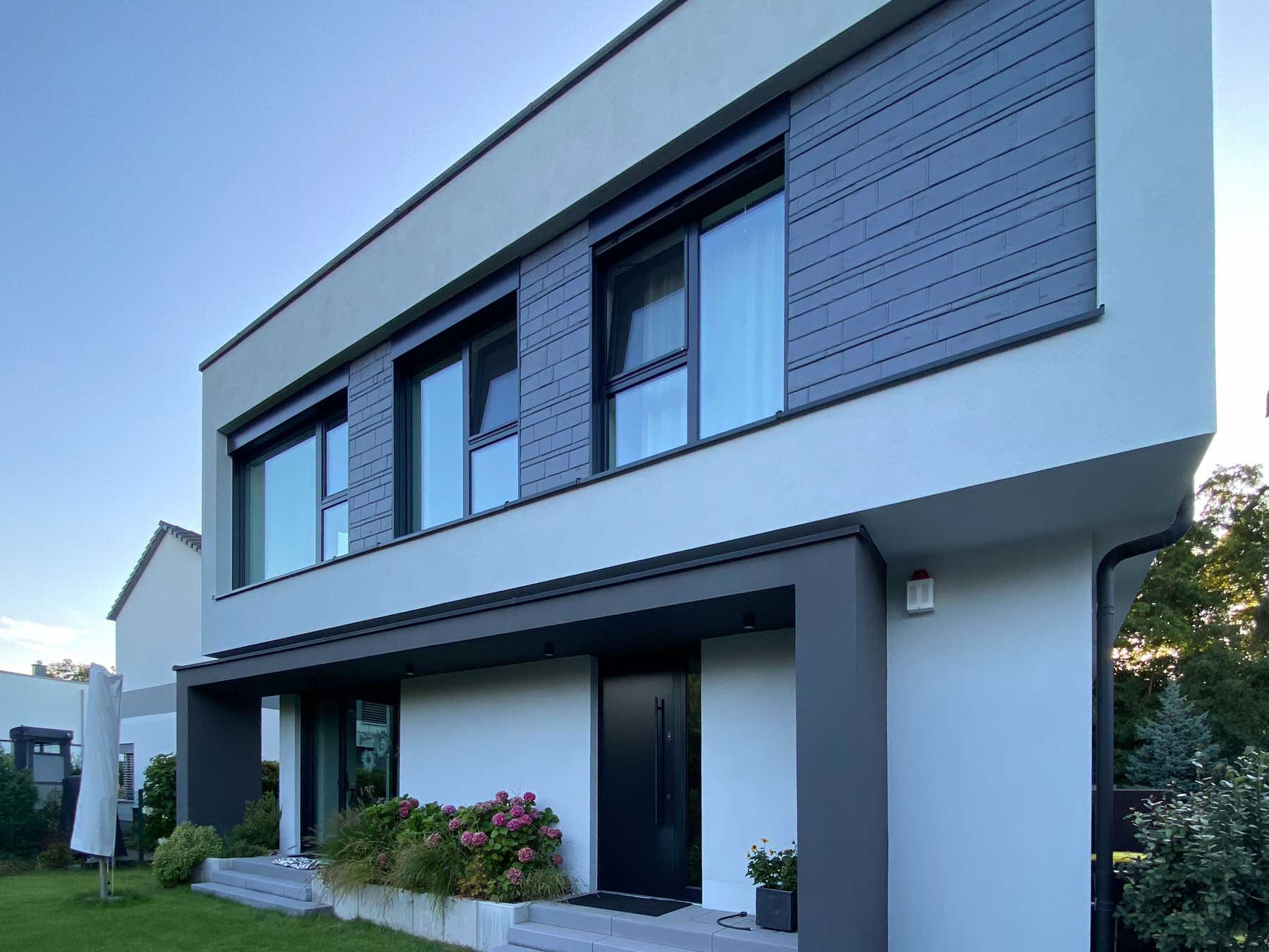 Das zweigeschossige Wohnhaus zeigt straßenseitig eine markante Schieferverkleidung, die durch eine obere und untere Rahmung in der Fassade gefasst wird. Der vorgelagerte Carport ergänzt das Ensemble funktional und fügt sich selbstverständlich in die Gesamtgestaltung ein. Dieses spezielle Material-, Flächen- und Volumenspiel verleiht dem Gebäude eine prägnante, moderne Architektursprache und Alleinstellung.