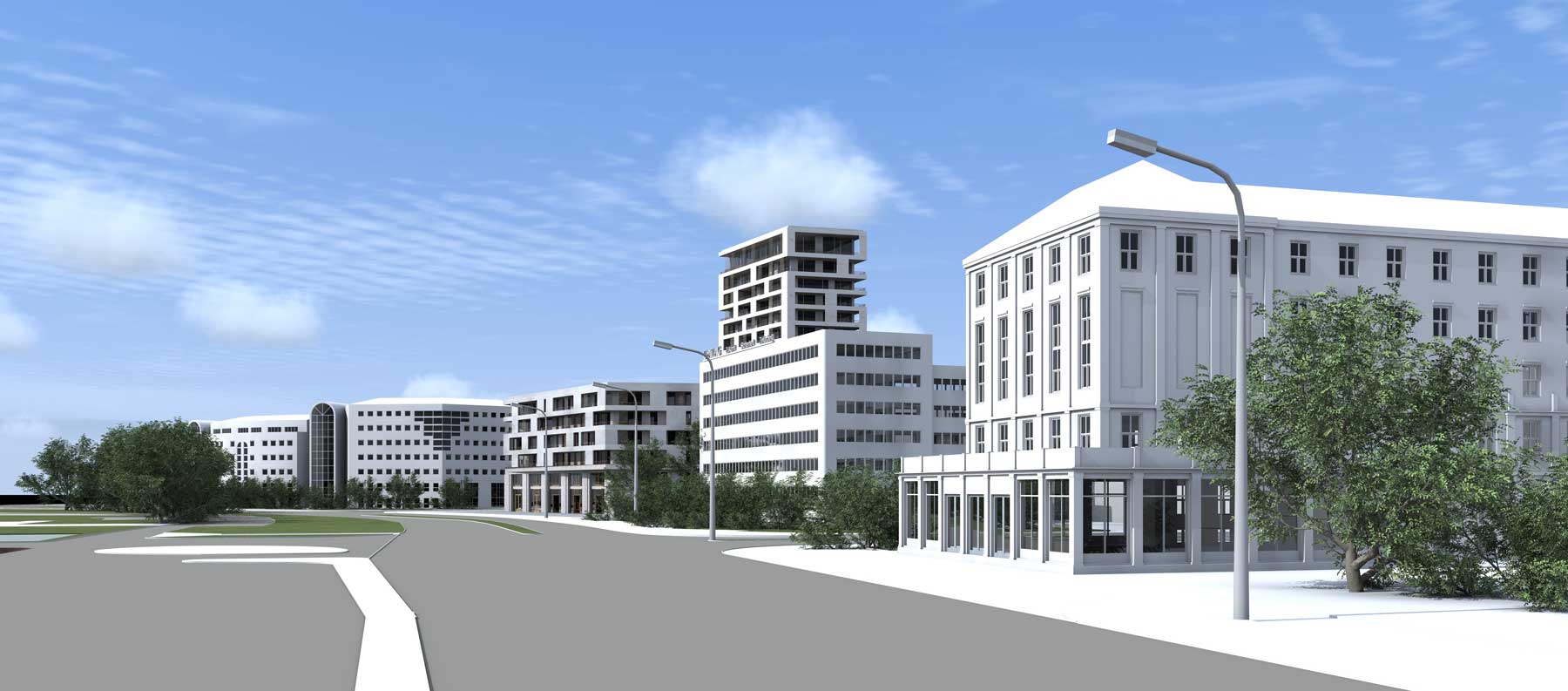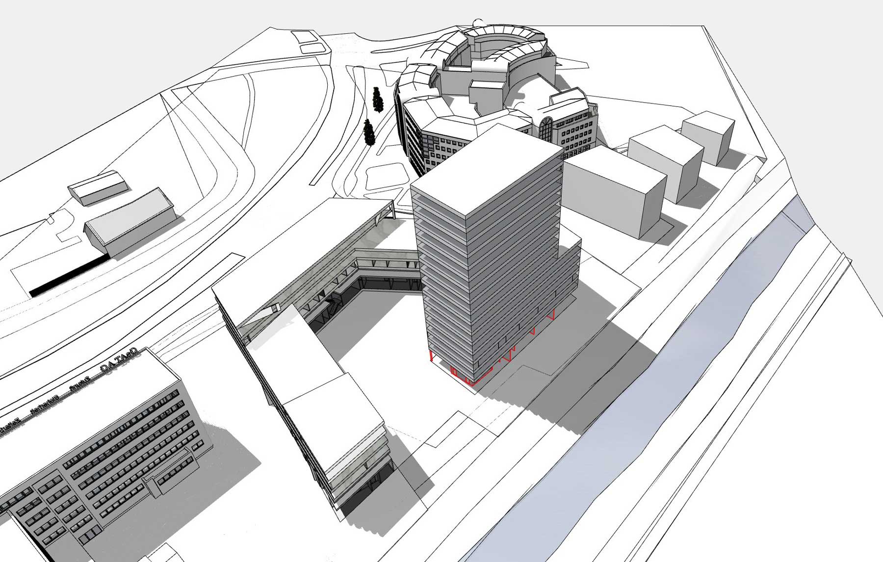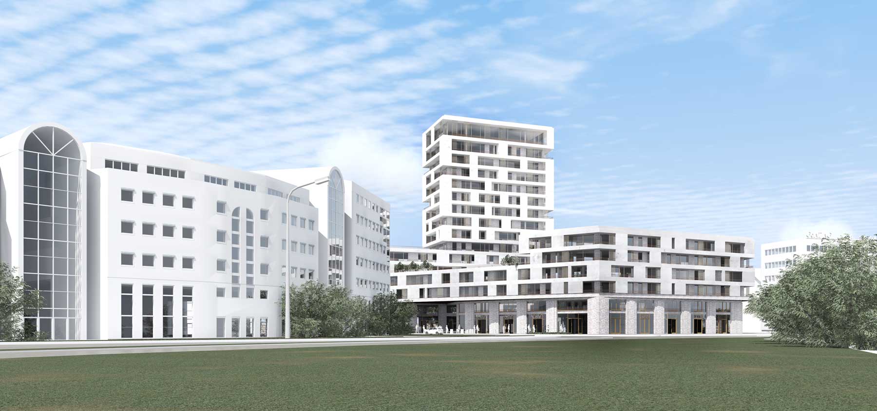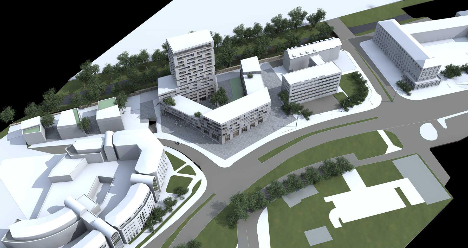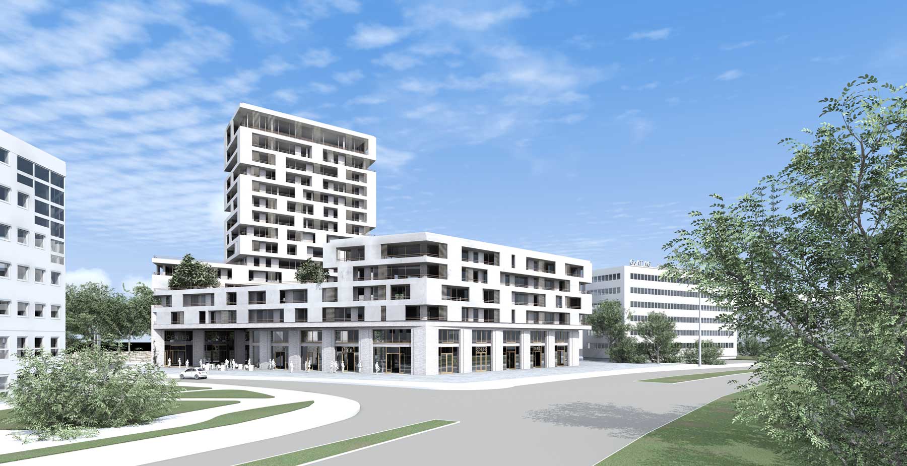 Der Entwurf setzt mit einem markanten Wohnturm auf einem funktional durchmischten Sockelbau einen städtebaulichen Akzent am stadträumlich bedeutsamen Ring. Vorgesehene Nutzungen sind altersgerechtes Wohnen, urbane Apartments und familiengerechte Wohneinheiten, ergänzt durch Geschäfts- und Serviceflächen in Erd- und Untergeschoss.