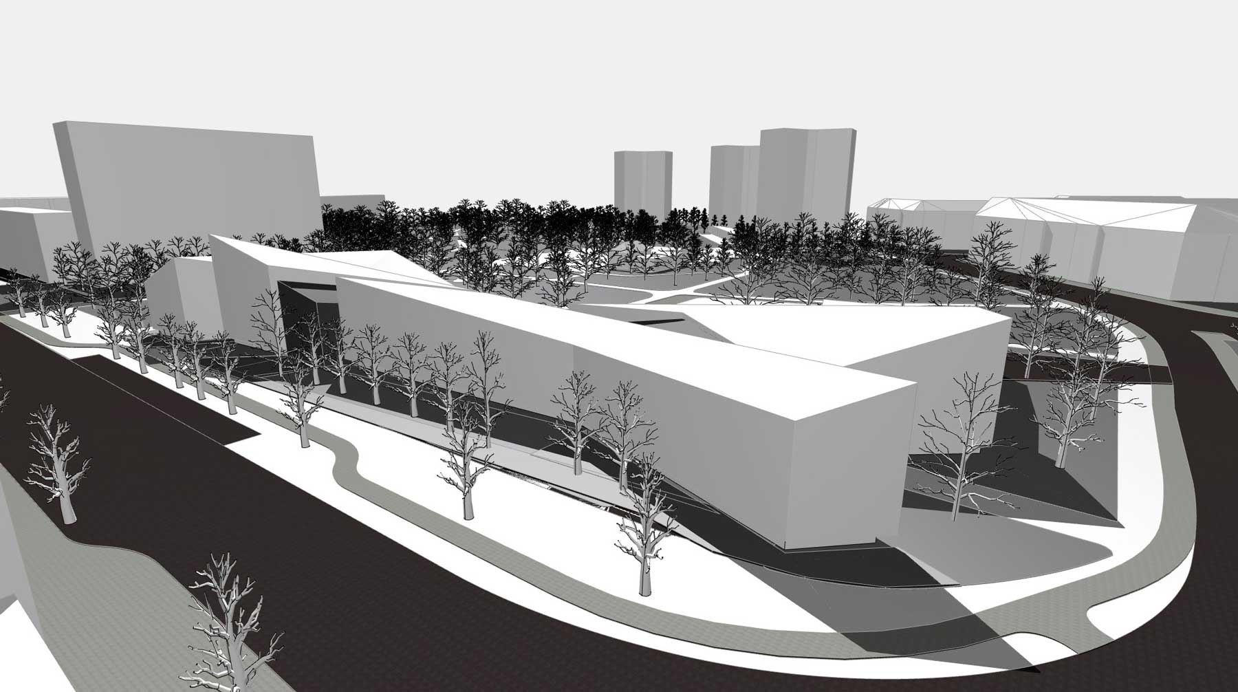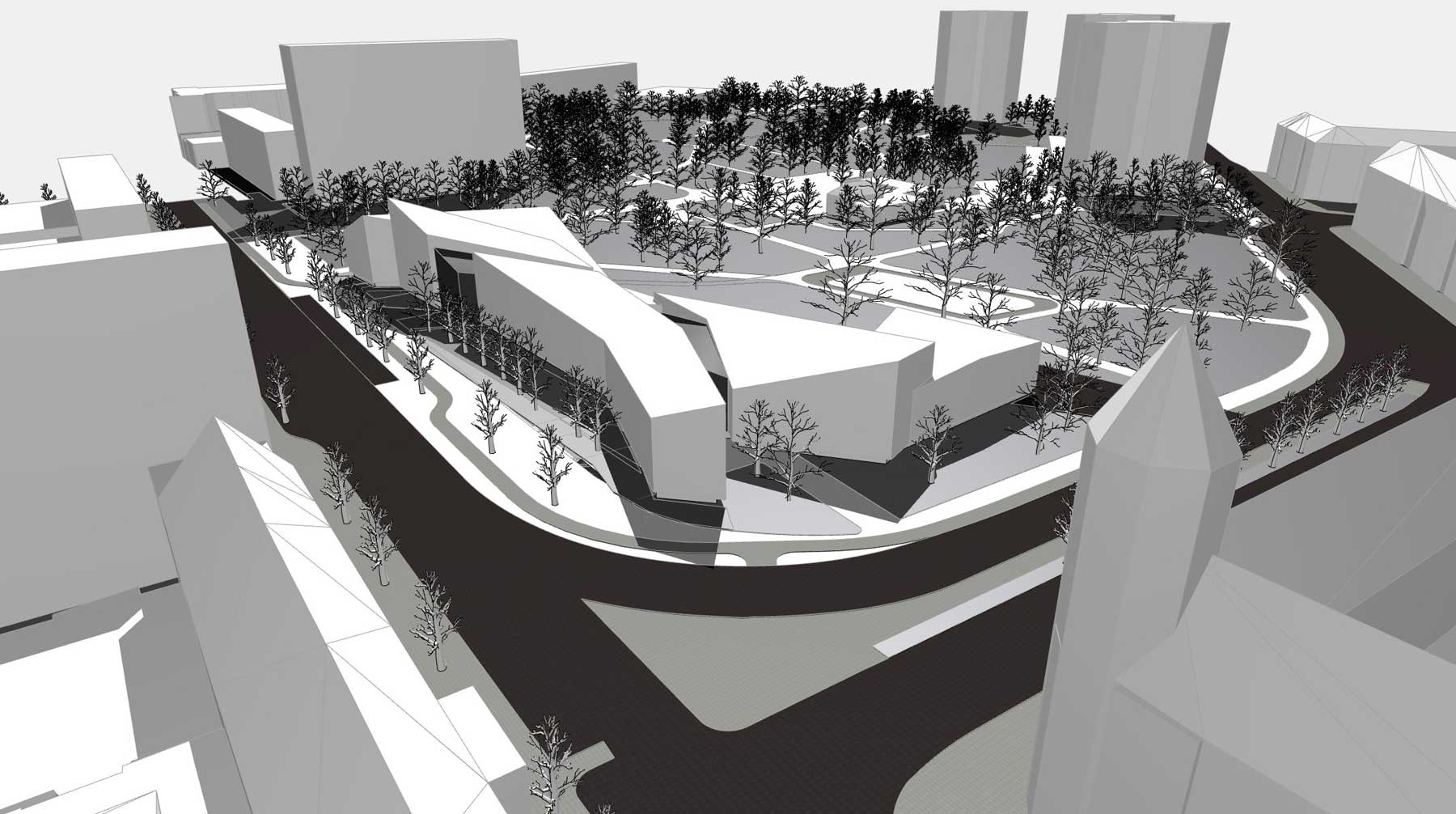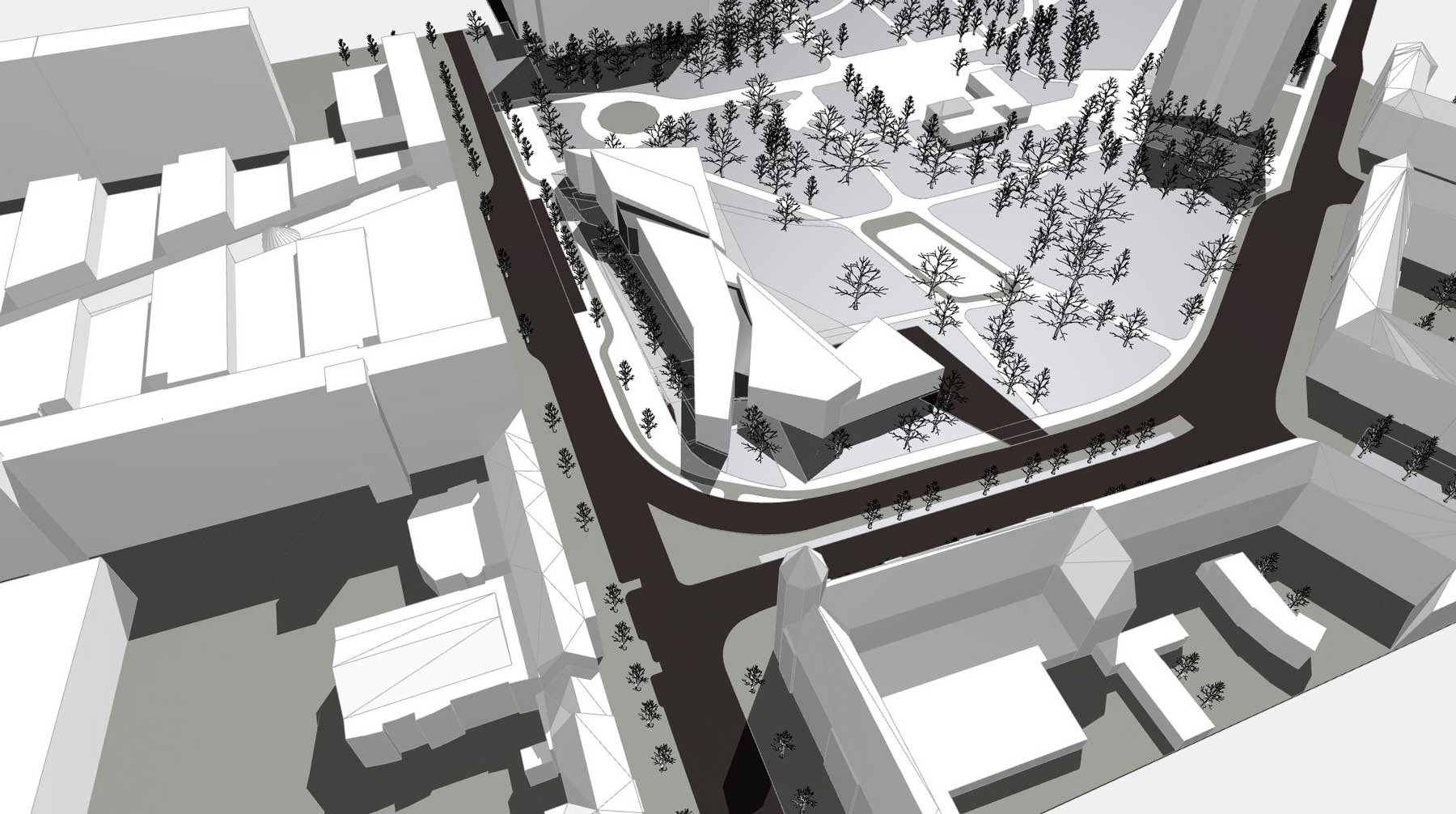 Städtebaulich fungiert das Gebäude als solitärer Stadtbaustein und vermittelt zugleich zum angrenzenden Park. So entsteht eine starke Verzahnung von gebautem Raum und Landschaft, welche die gesamtstädtische Bedeutung des Bauwerks unterstreicht und es besonders niedrigschwellig und publikumszugewandt macht.