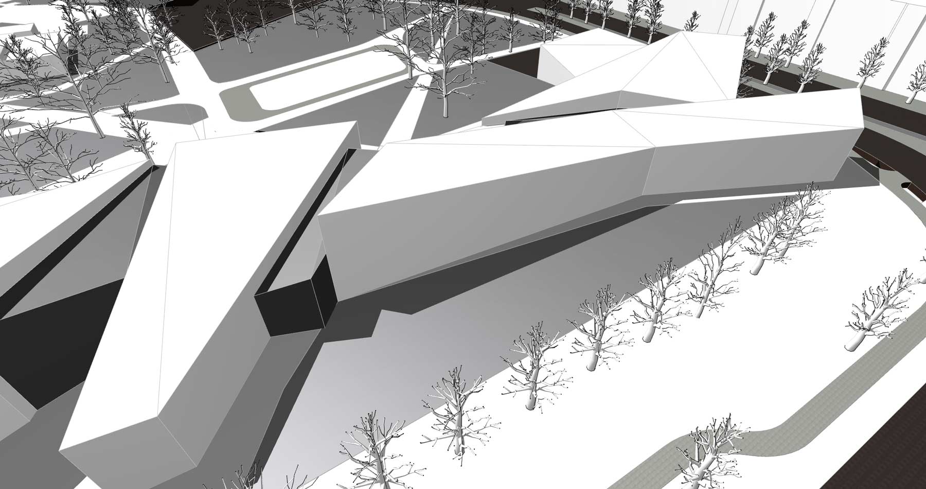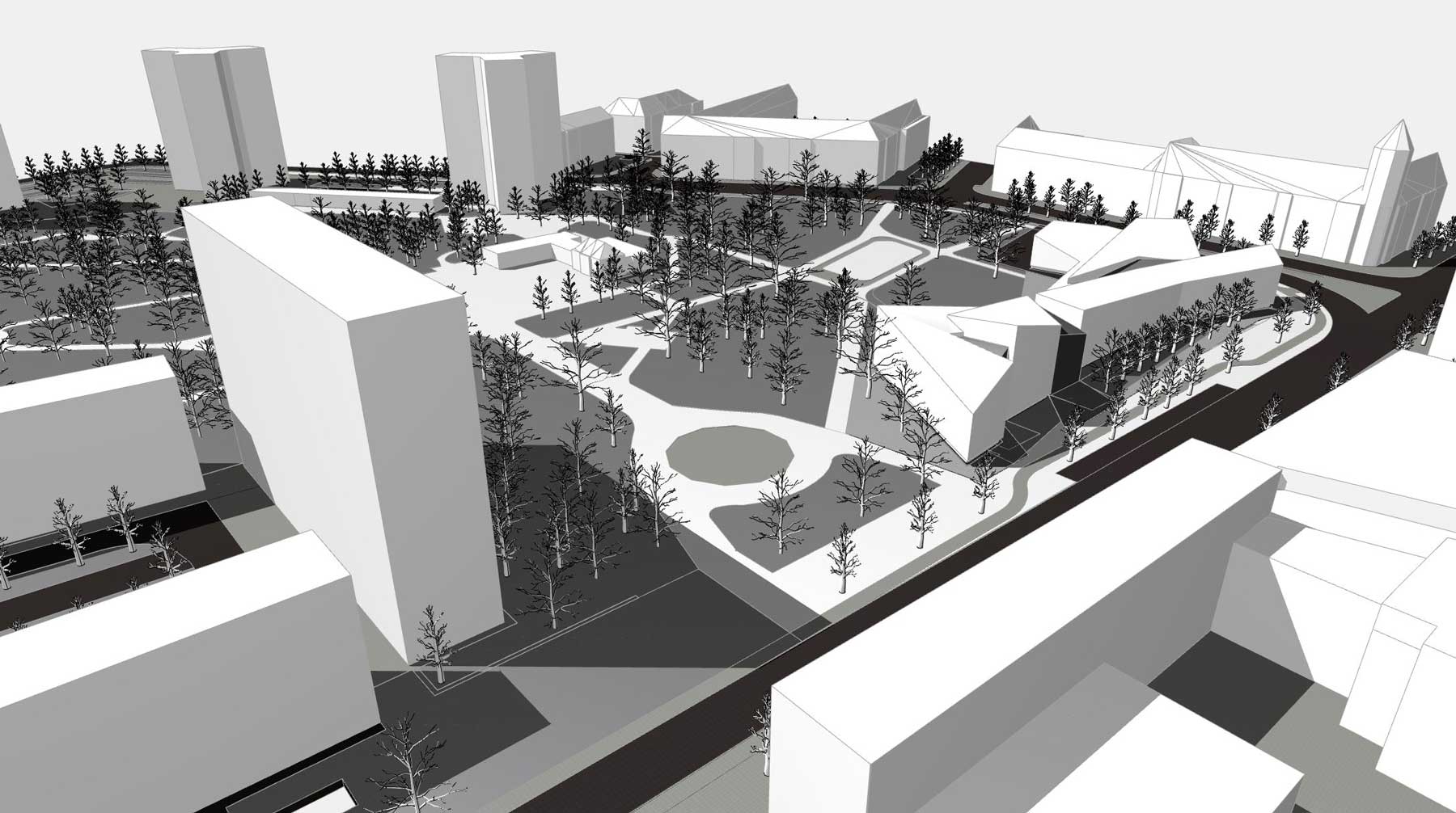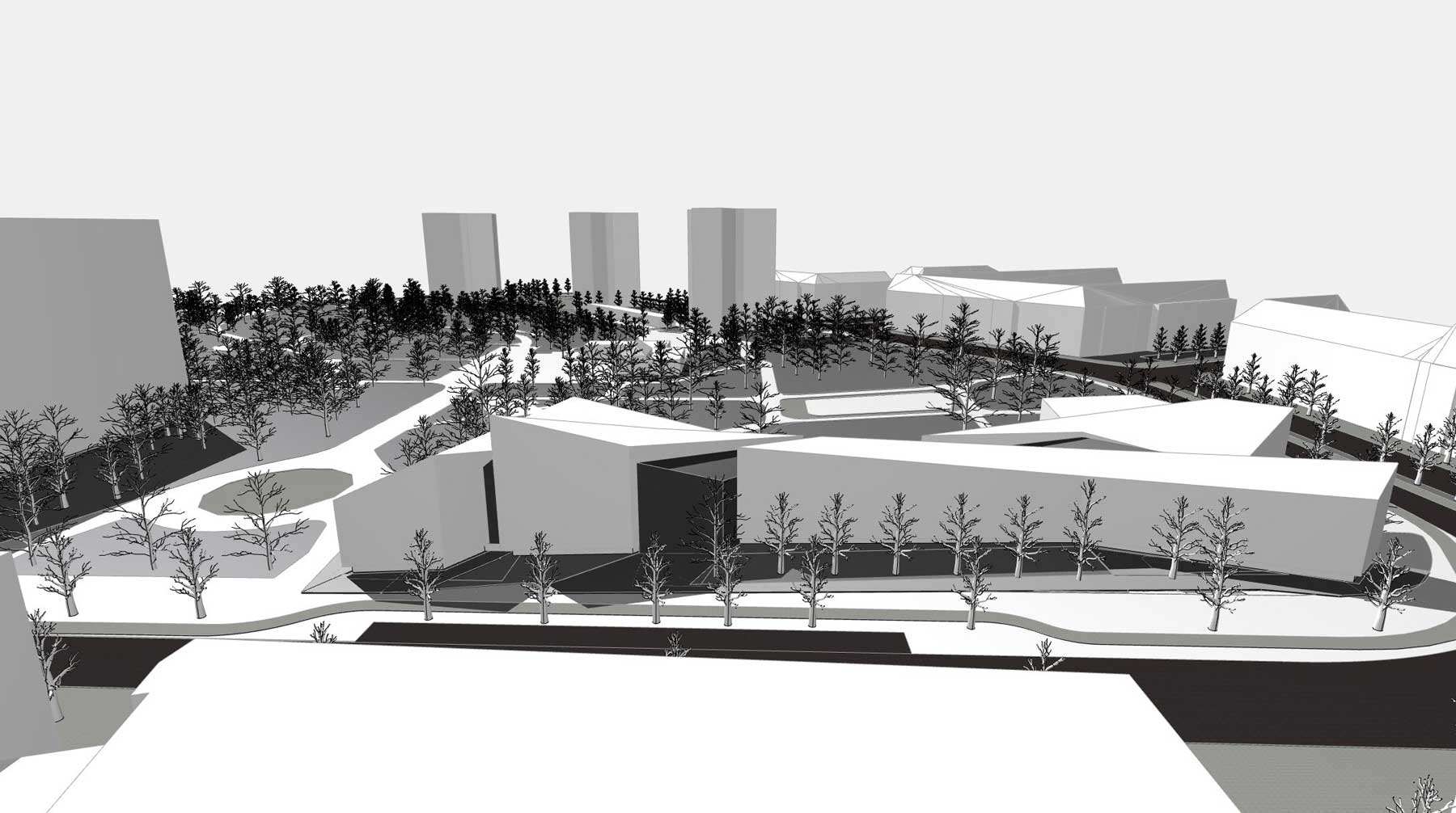 Städtebaulich fungiert das Gebäude als solitärer Stadtbaustein und vermittelt zugleich zum angrenzenden Park. So entsteht eine starke Verzahnung von gebautem Raum und Landschaft, welche die gesamtstädtische Bedeutung des Bauwerks unterstreicht und es besonders niedrigschwellig und publikumszugewandt macht.
