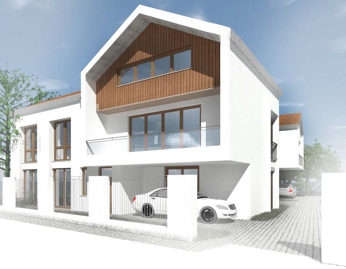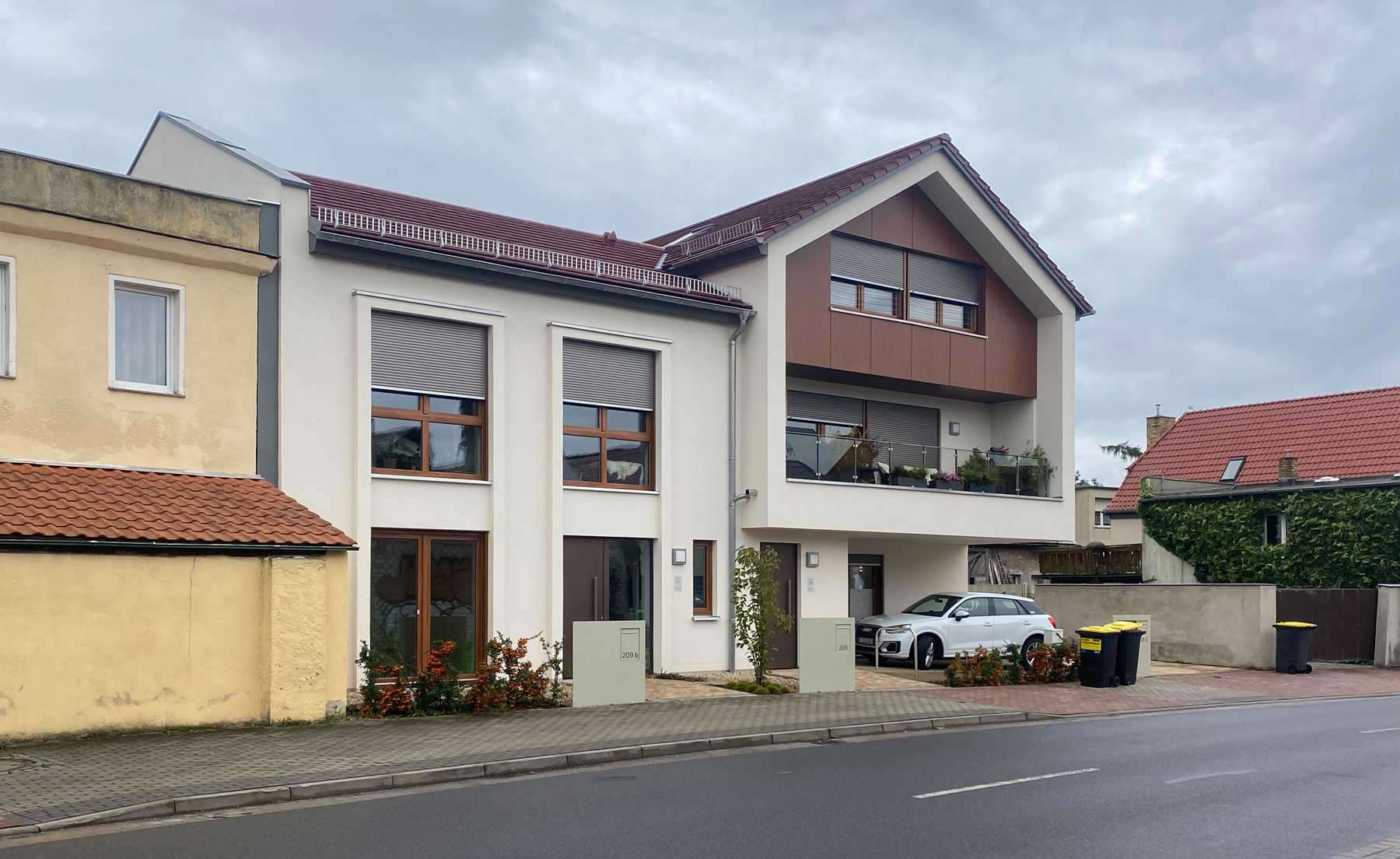 Das Bauvorhaben in Markkleeberg zeigt eine zeitgemäße Fortführung der bestehenden Randbebauung und setzt auf eine hohe Bebauungsdichte innerhalb des relativ kleinen Grundstücks.